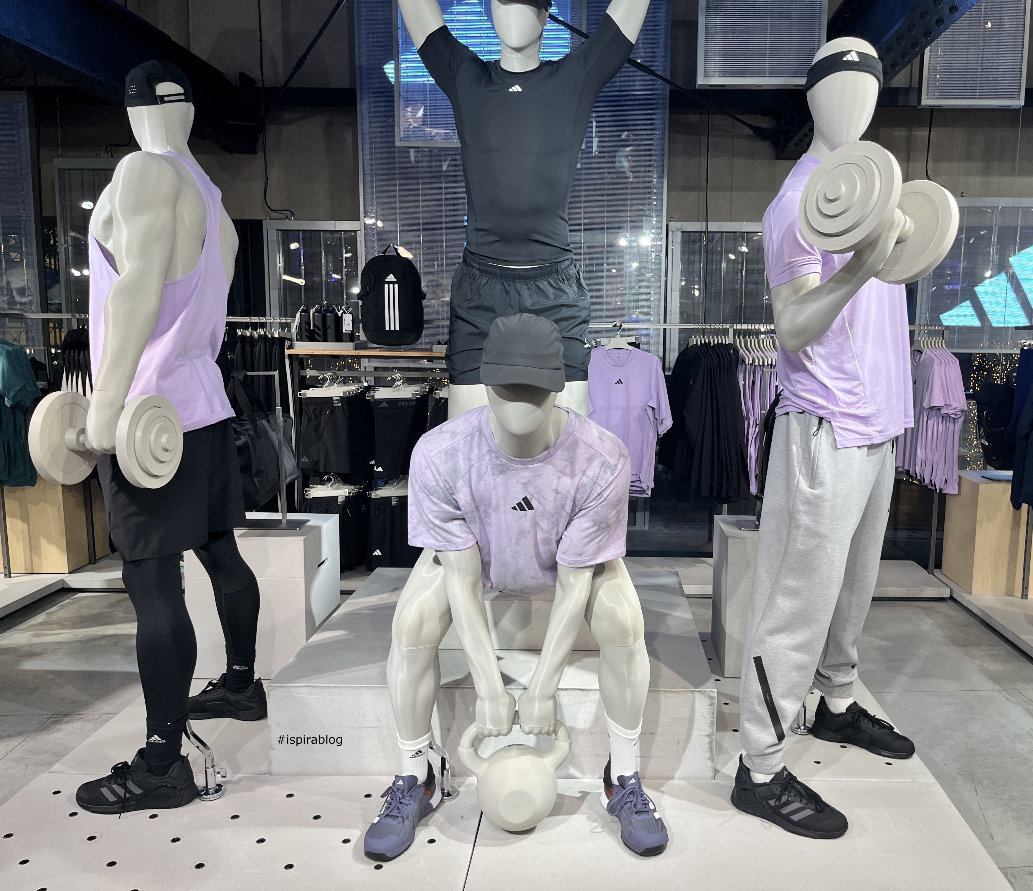 Adidas - Barcelona - Autumn 2018 - Menswear Collection - internal view of the store - light blue T-shirt and black shorts with black sneakers 2018-10-15