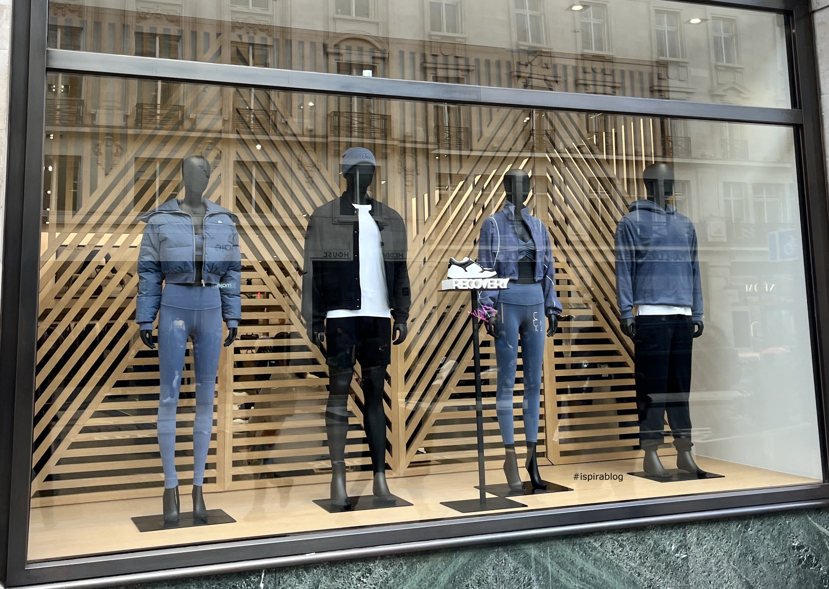 Alo Yoga London - Spring 2025 Collections - white tracksuit, blue top tank and leggings, and grey down, in the back black and grey sportswear and white jerseys 2025-03-06