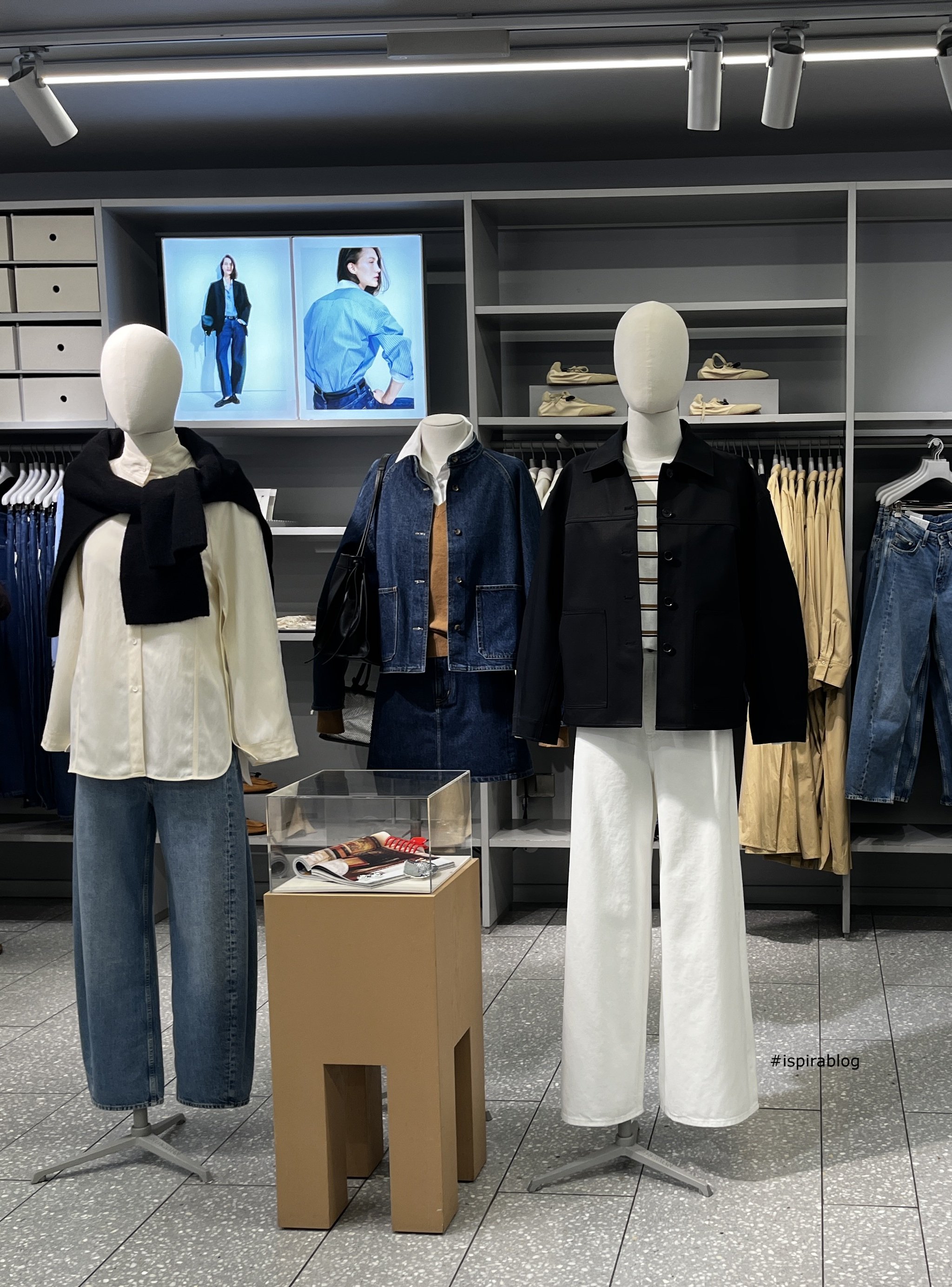 Arket London - Fall 2021 - Menswear Collection - on the table jeans trousers with black shoes and backpack, in the back white shirts with jeans shirts and trousers, and black jackets 2021-10-15