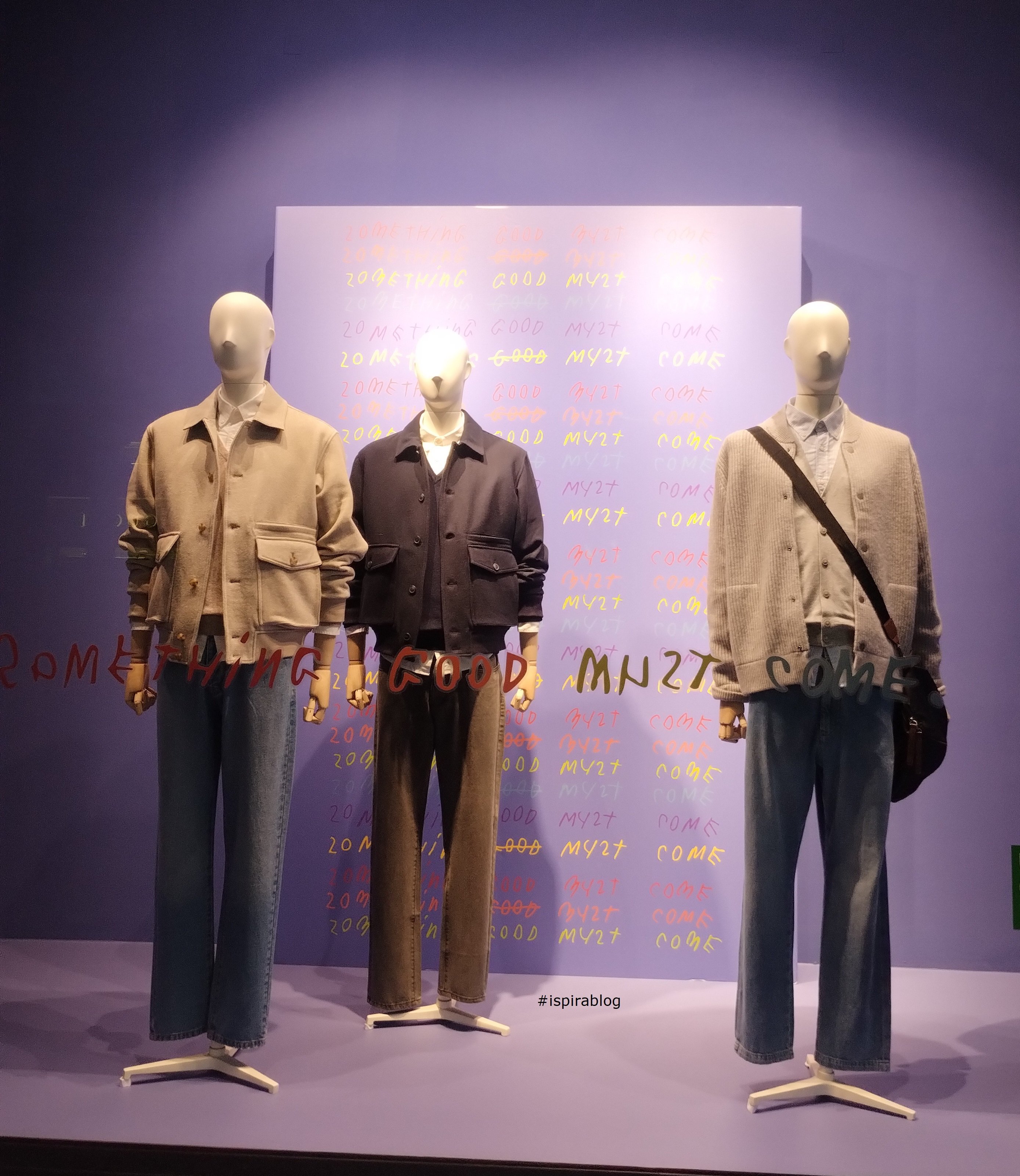 Benetton - Milan - Fall 2019 - Menswear Collection - clothes of various colours with blue jacket, jeans trousers and black sneakers 2019-11-11