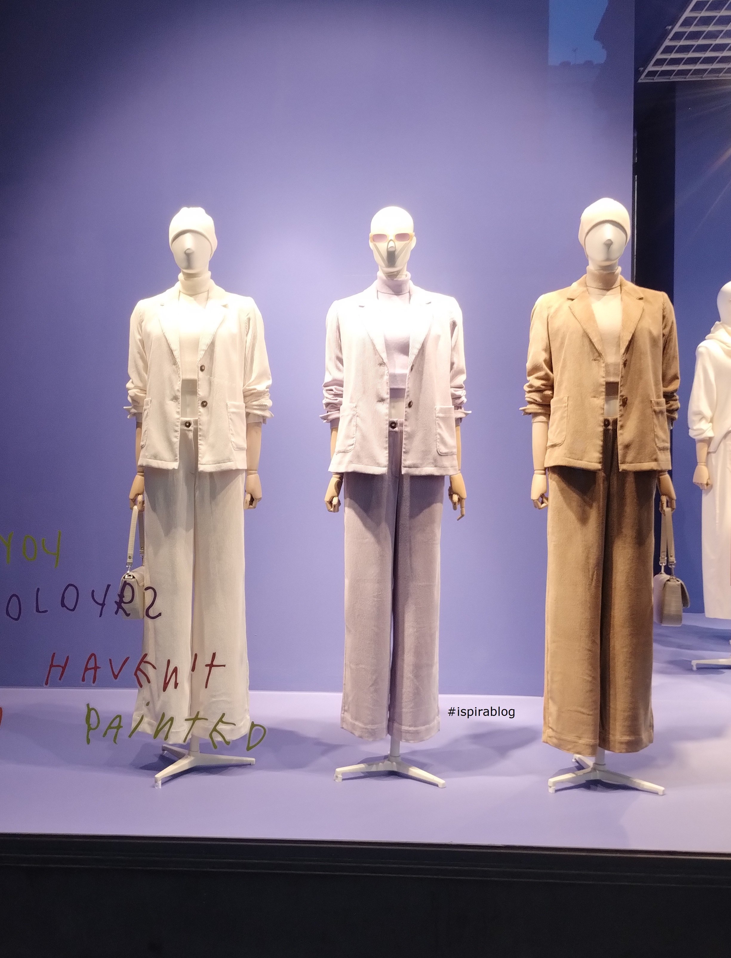 Benetton Barcelona - Spring 2024 Womenswear Collection - trousers of various colours with beige jerseys, hoodies and trousers of different colours, lilac, blue and white garments 2024-03-20
