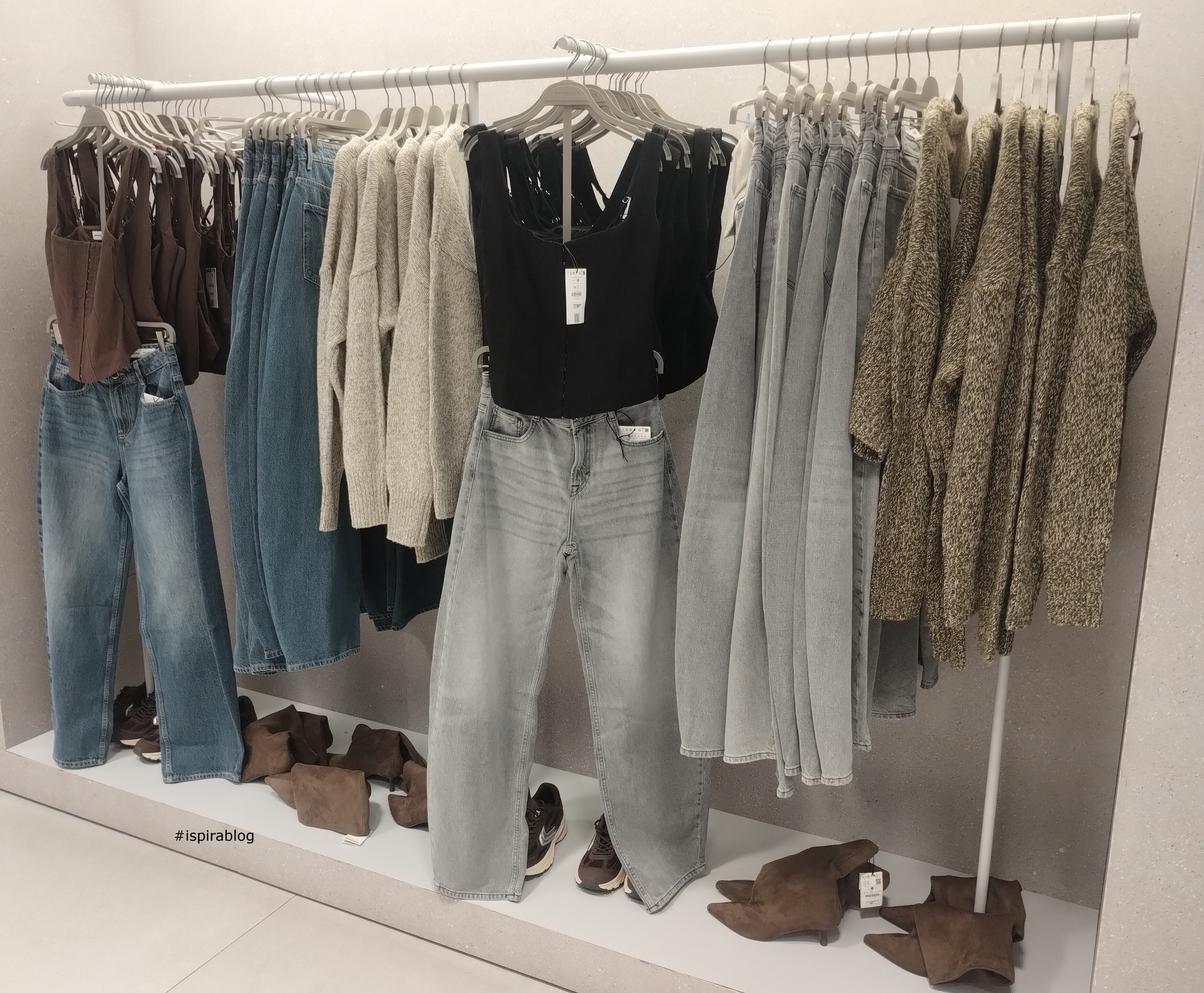 Bershka Turin - Pre Spring 2026 Collection - jeans with white and beige jumpers, brown and black top tanks, and brown boots 2026-02-11