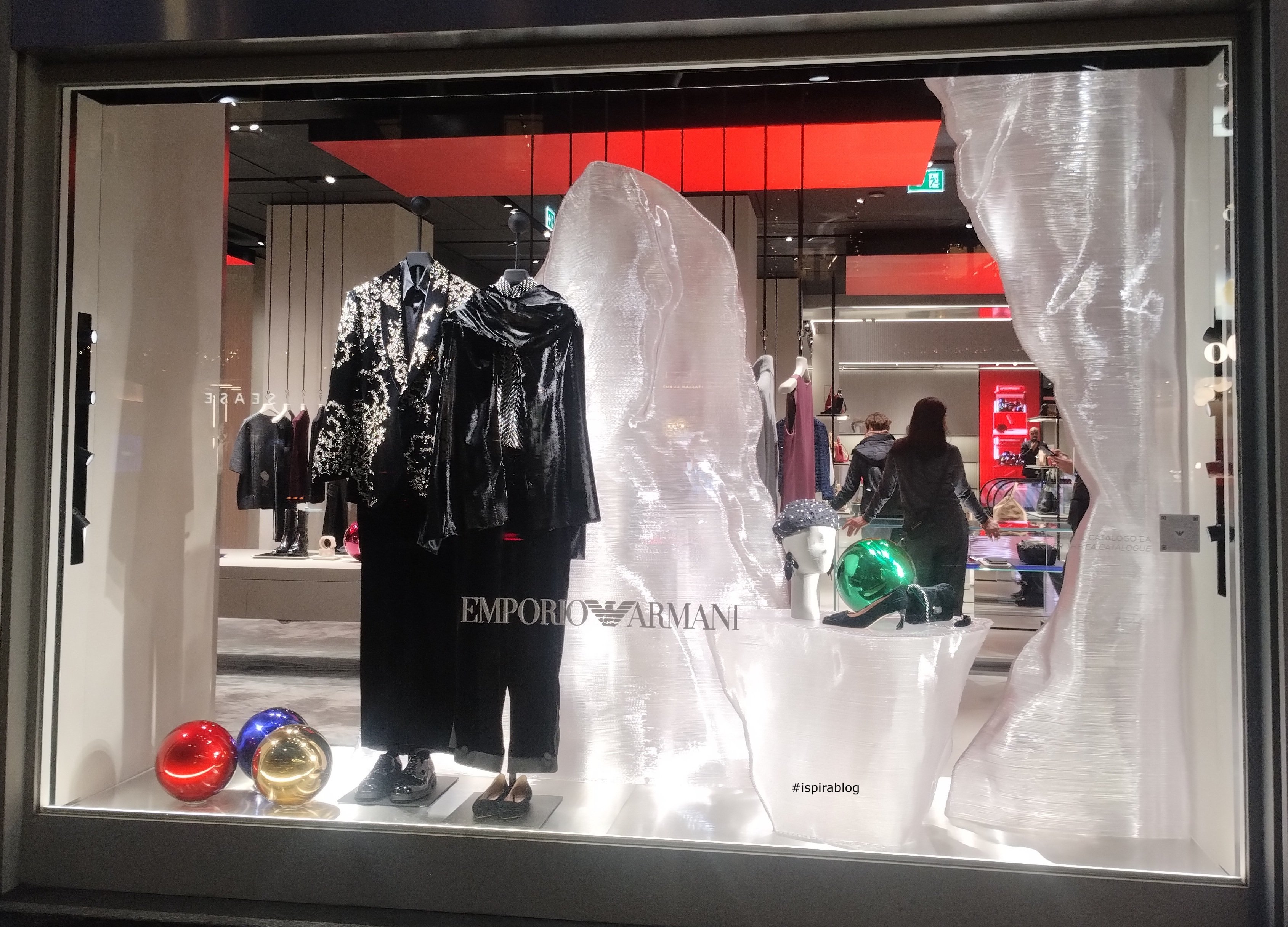 Emporio Armani Rome - Summer 2021 Womenswear Collection - internal view of the store, black dresses, white leather shoes and handbags of various sizes 2021-06-07