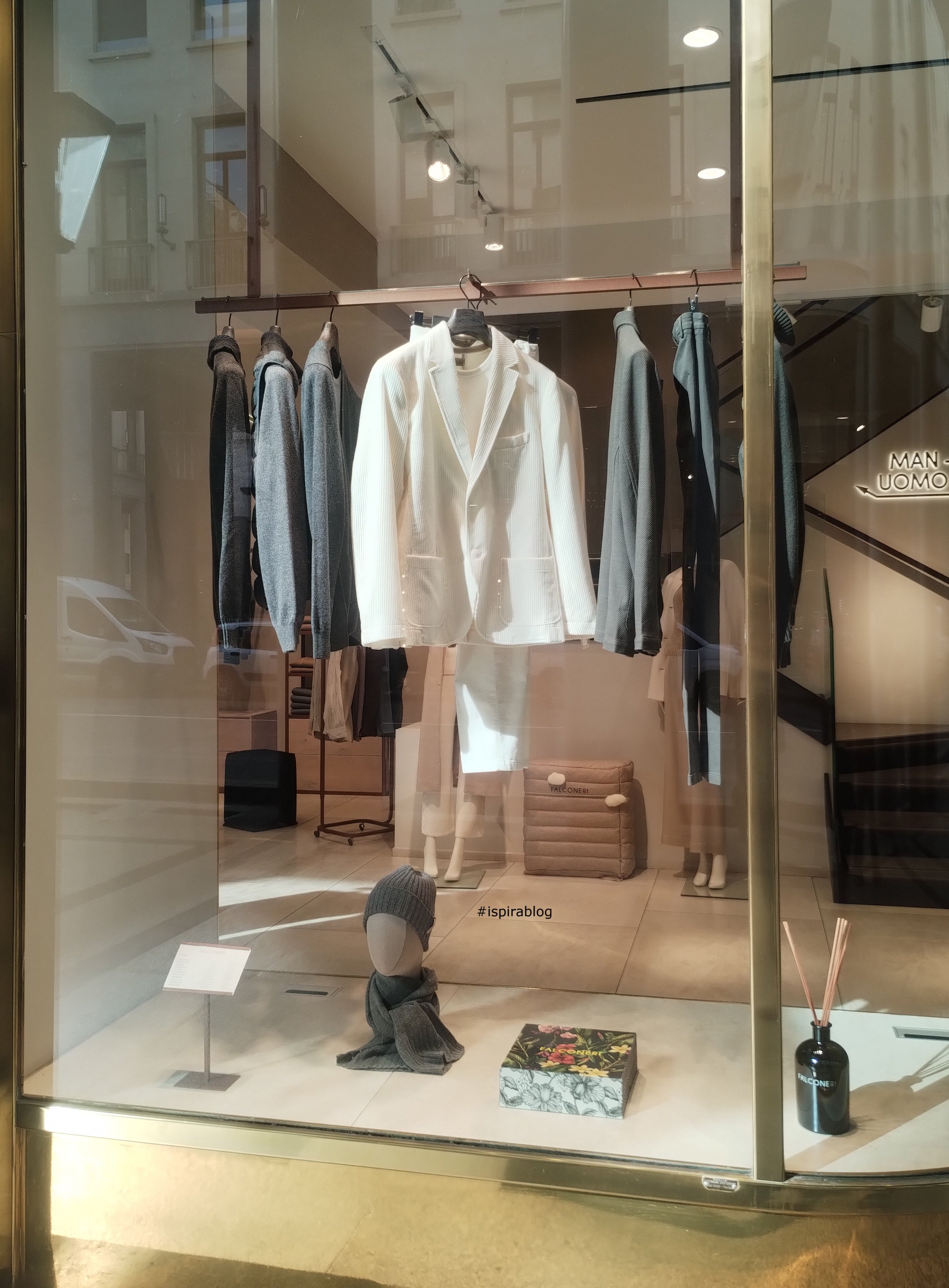 Falconeri Turin - Fall 2025 Menswear Collection - white blazer and trousers, with grey sweaters and trousers, and grey cap and scarf 2025-10-23