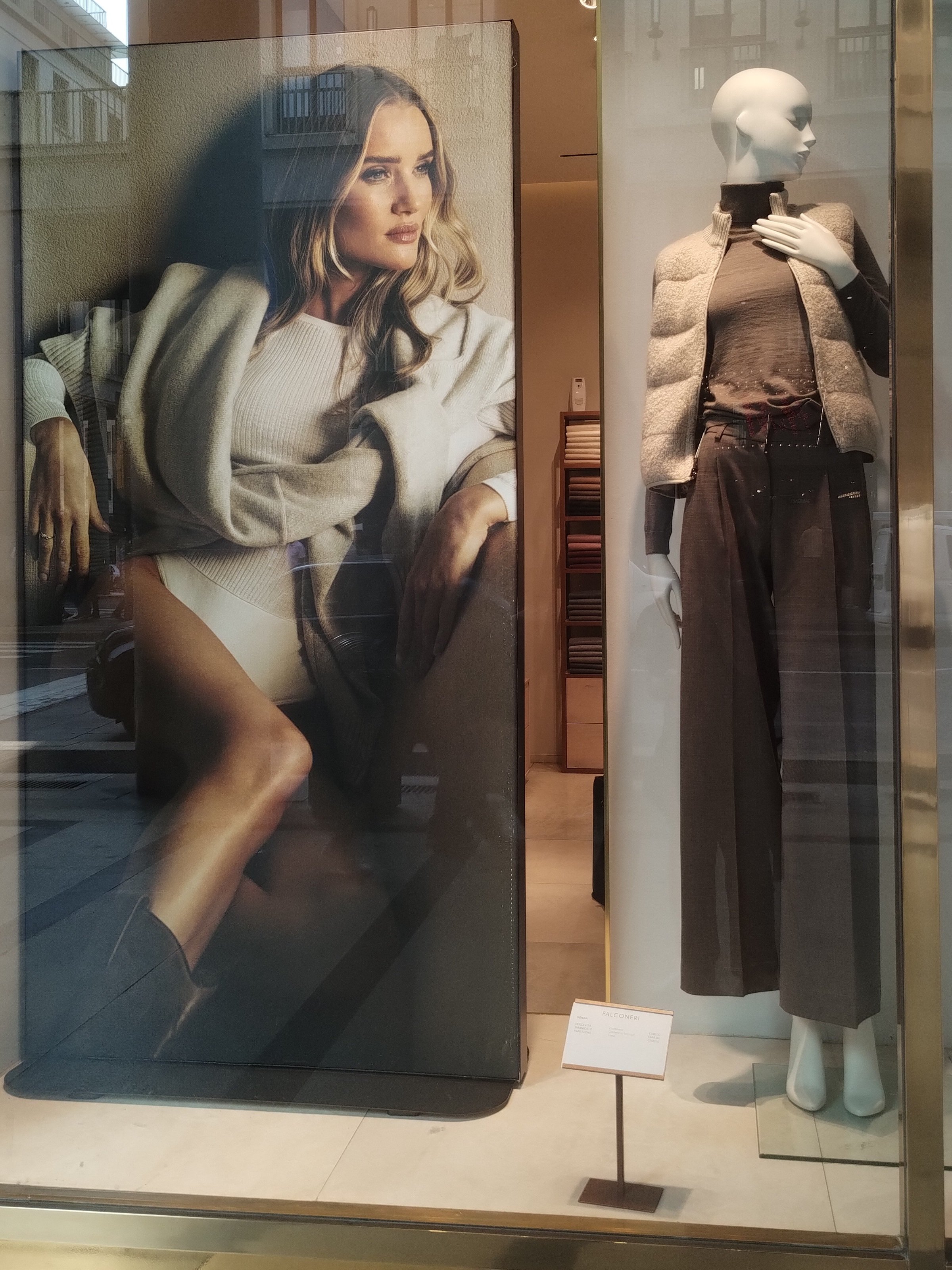 Falconeri Turin - Fall 2022 - Womenswear Collection - patterned shirt with beige sweater and grey trousers, garments of various colours on the right 2022-09-07