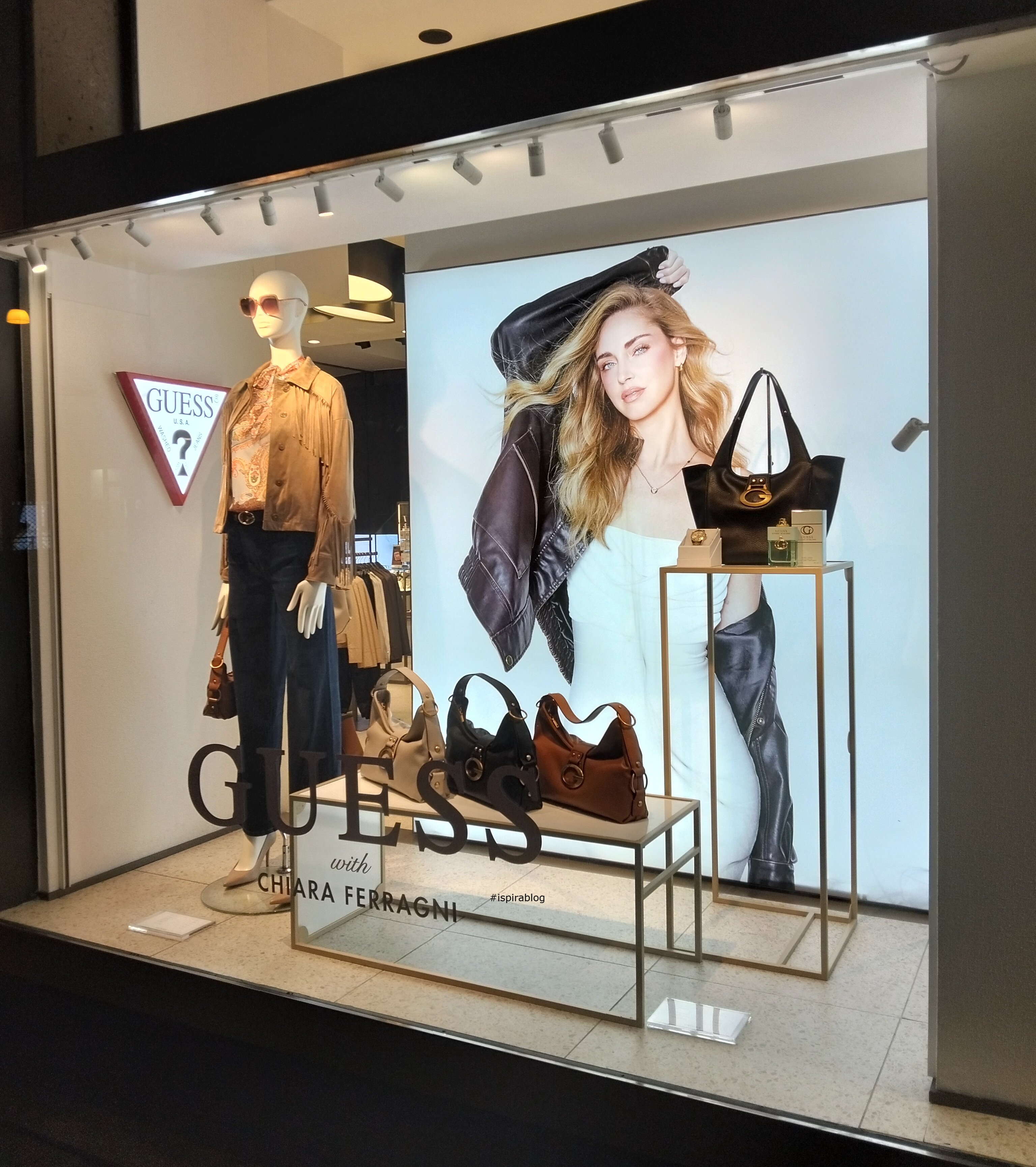 Guess Turin - Pre Fall 2025 Womenswear Collection - patterned blouse and dress, with jeans, black eco leather jacket, heeled sandals, black and brown small backpacks and white sneakers 2025-09-02