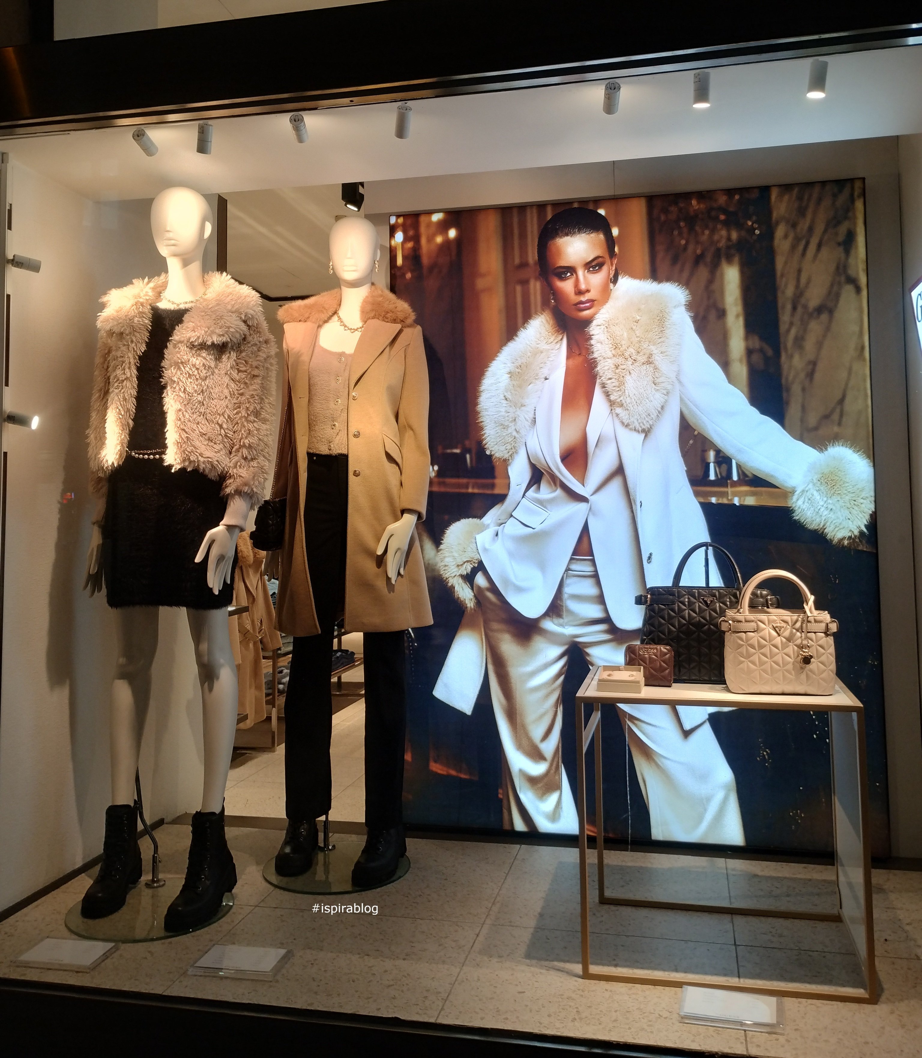 Guess Turin - Winter 2025/26 Collection - black dress with pink eco fur jacket and black boots, pink jersey with black trousers, beige coat and black boots, black and white handbags with brown wallet 2026-01-28