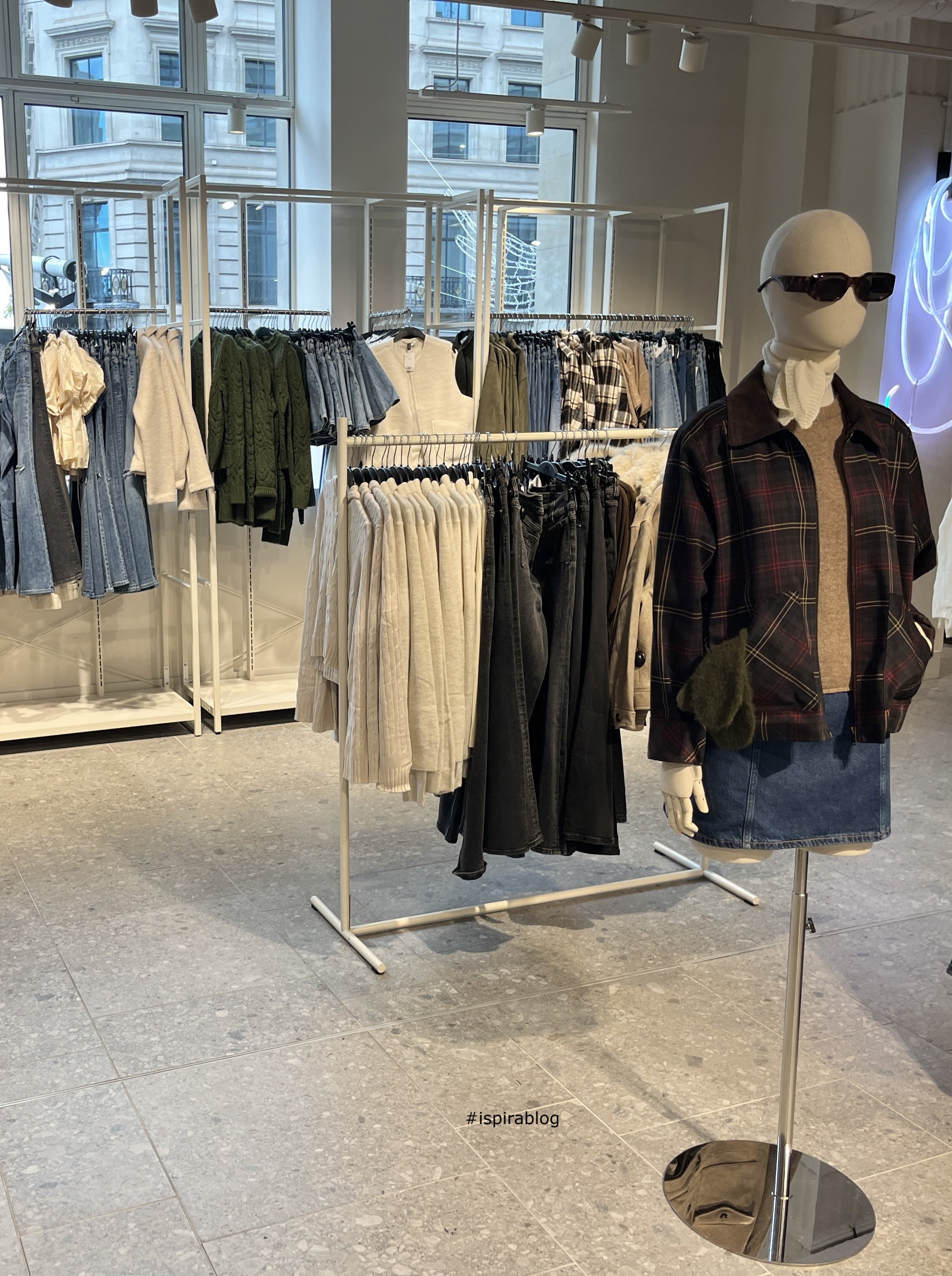 H&M London - Fall 2025 Collection - chequered jacket with brown sweater and jeans skirt, in the back jeans, sweaters, chequered shirts, and green jackets 2025-11-14