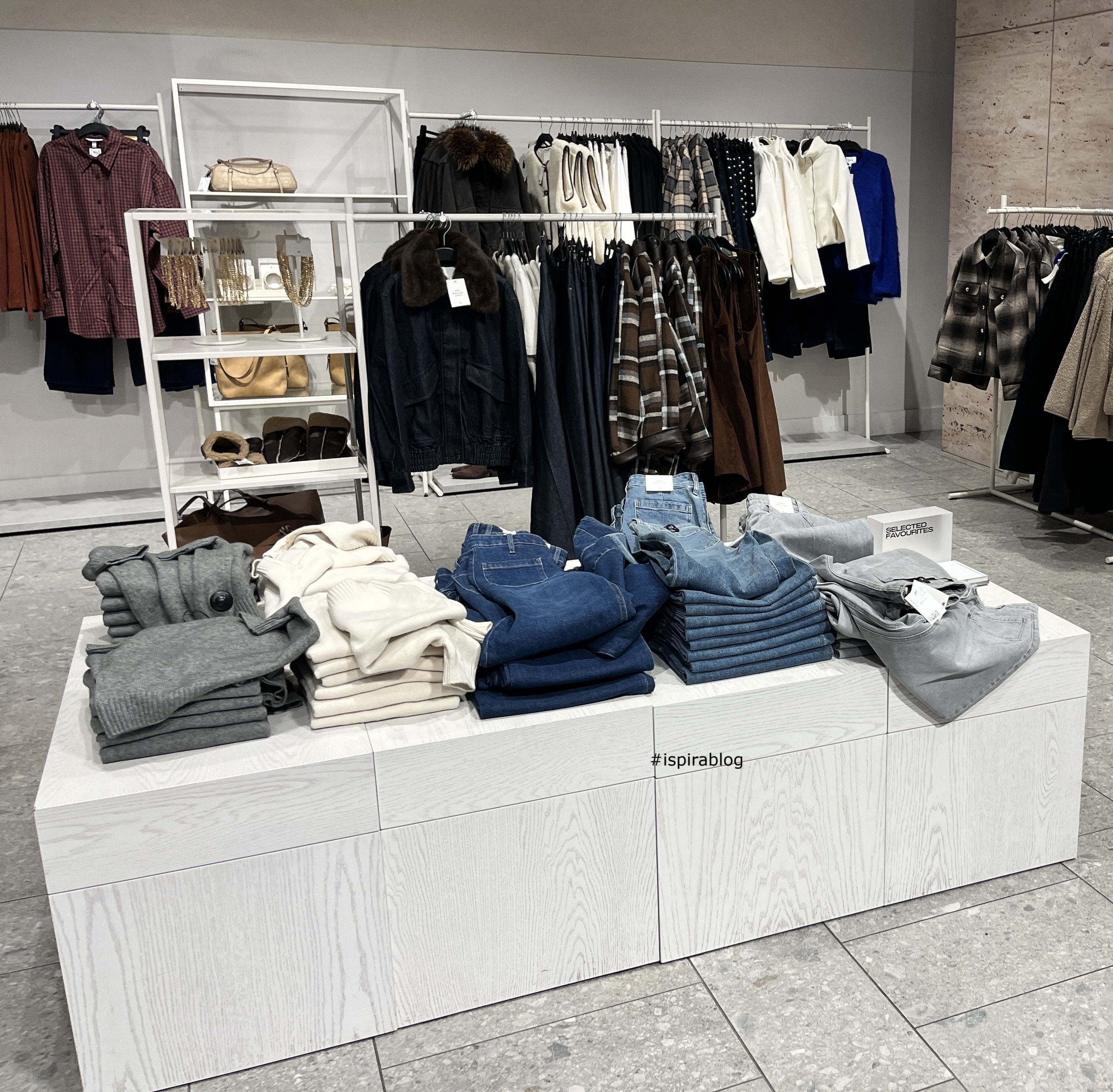 H&M Turin - Fall 2023 - Womenswear Collection - beige coats with brown sweatshirts, jeans pants and small black handbags 2023-11-21