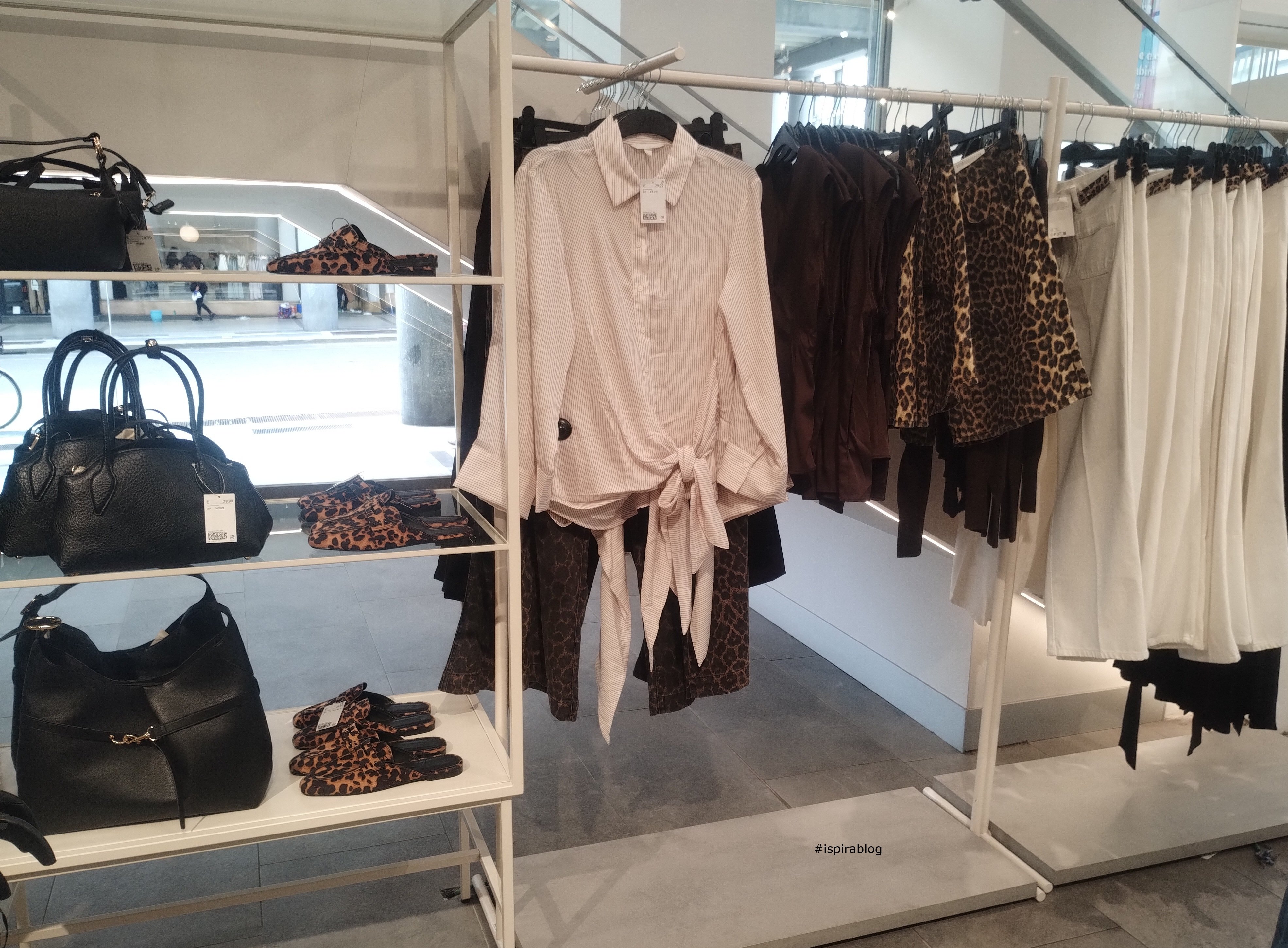 H&M Turin - Spring 2026 Collections - animalier patterned skirts, trousers, and shoes, with brown sleeveless blouses, white trousers, and black handbags 2026-04-30