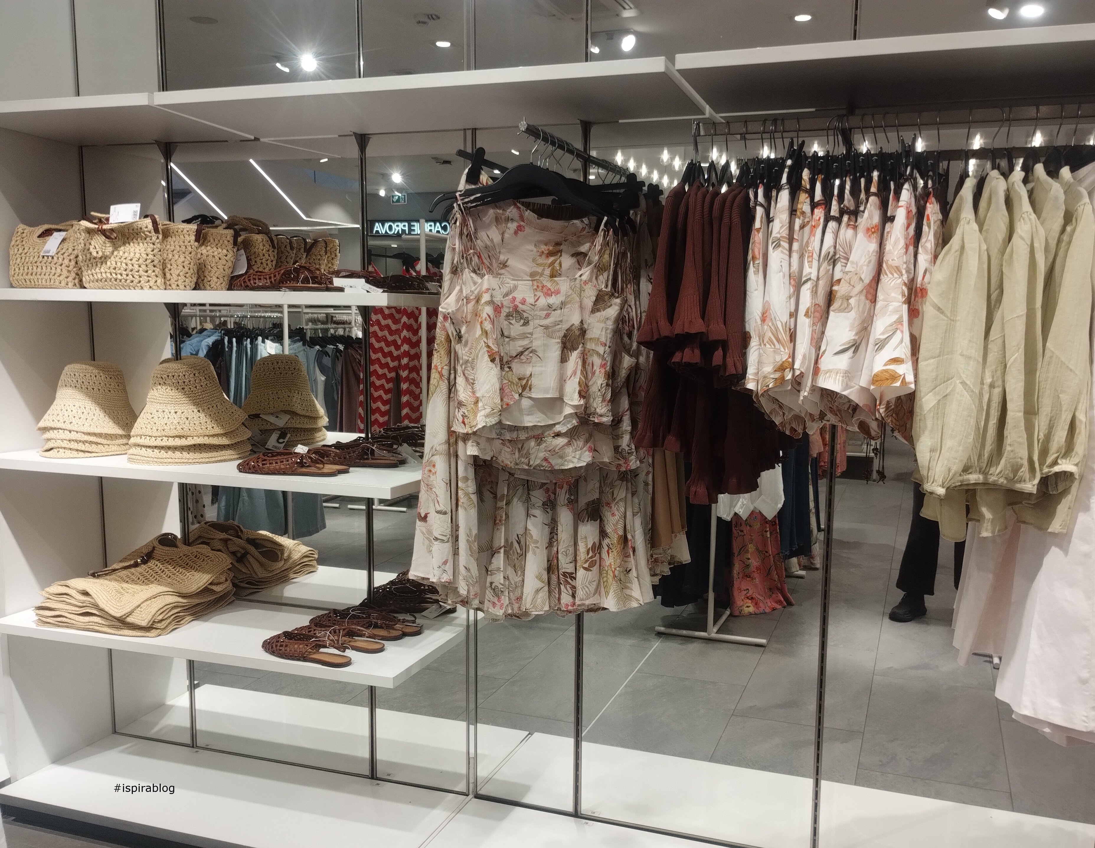 H&M Turin - Spring 2026 Collections - patterned top tanks, skirts and shorts, with brown and beige blouses, beige caps and bags, and brown shoes 2026-04-30