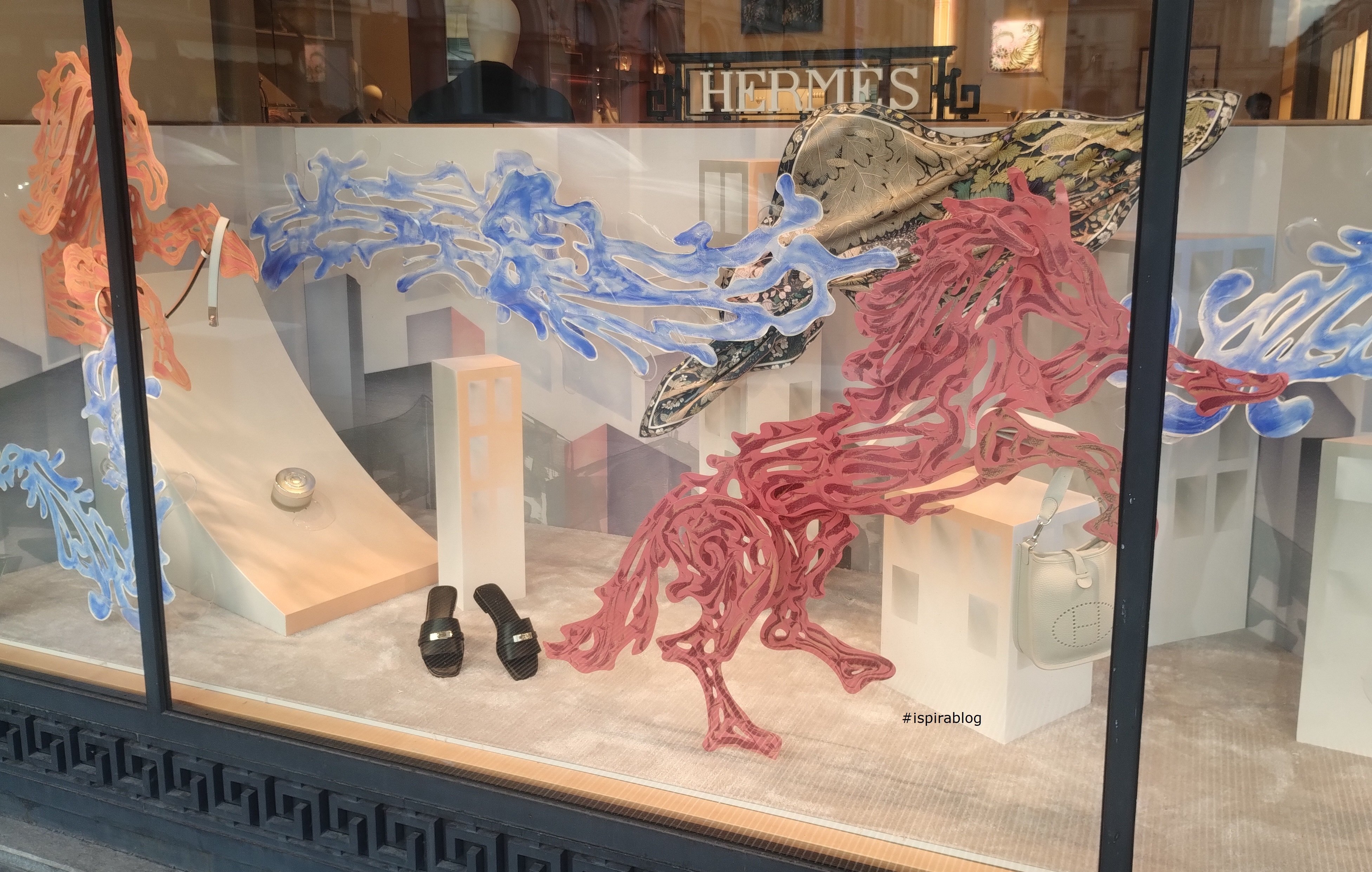 Hermes Turin - Fall 2024 Collections - patterned blanket and bag, with frame and decor objects, red leather sandals, and patterned foulard 2024-10-17