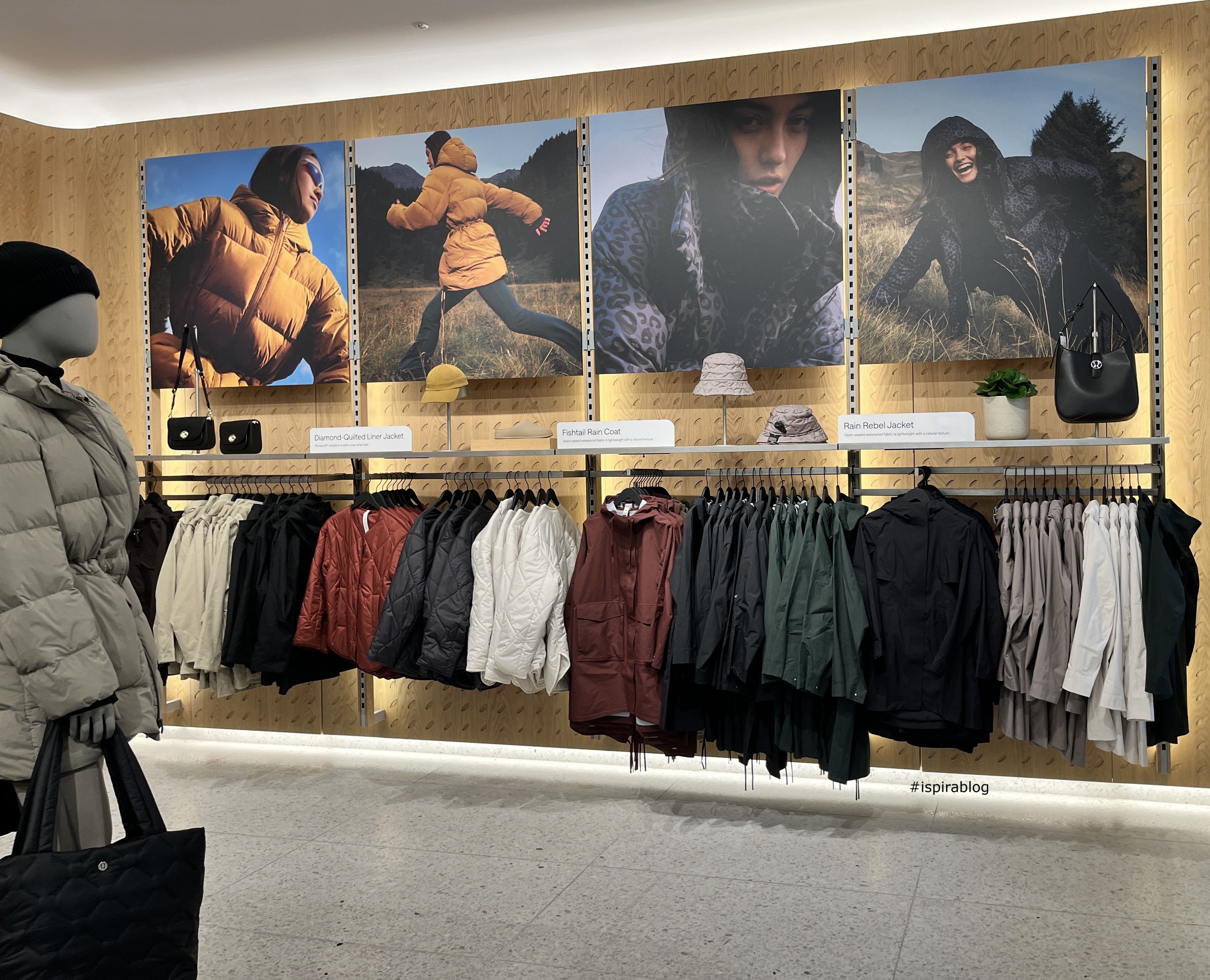 Lululemon London - Fall 2025 Collection - beige down jacket and trousers with black cap and handbag, down jackets, raincoats and hats of various colours 2025-11-04