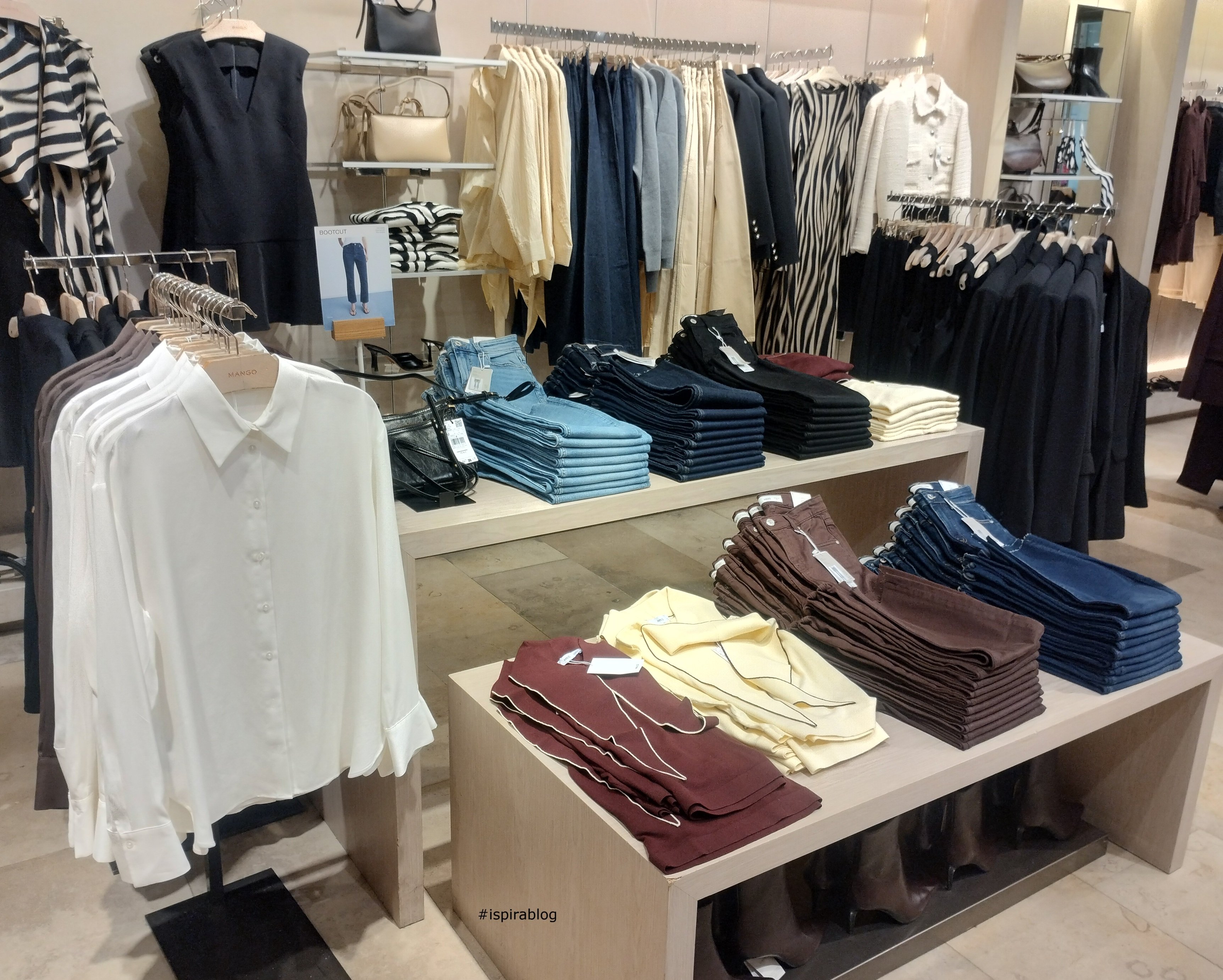 Mango Turin - Fall 2024 - Womenswear Collection - grey and black womenwear, with white coats and shirts, blue dresses, jeans of various colours and black and white shoes 2024-10-03