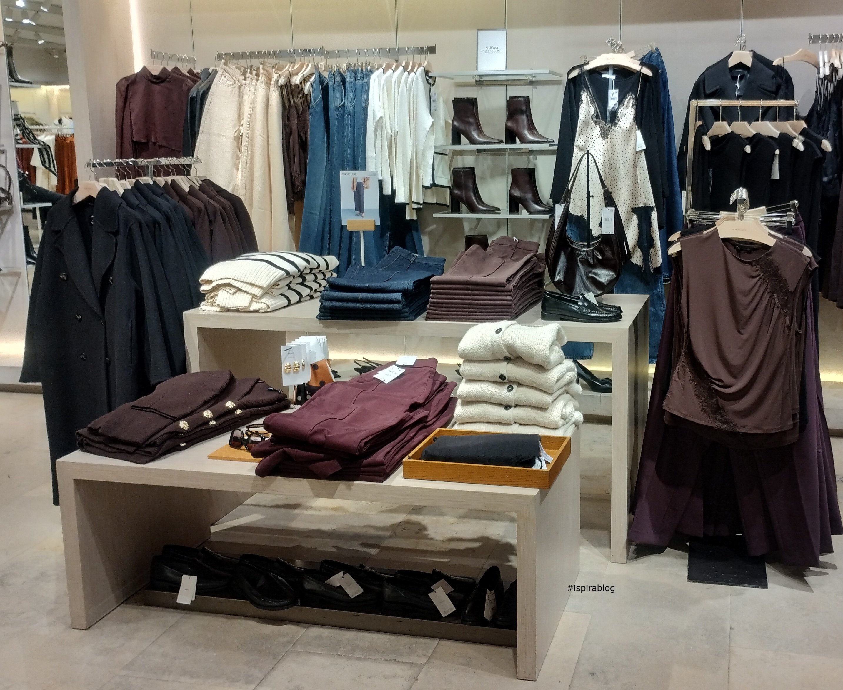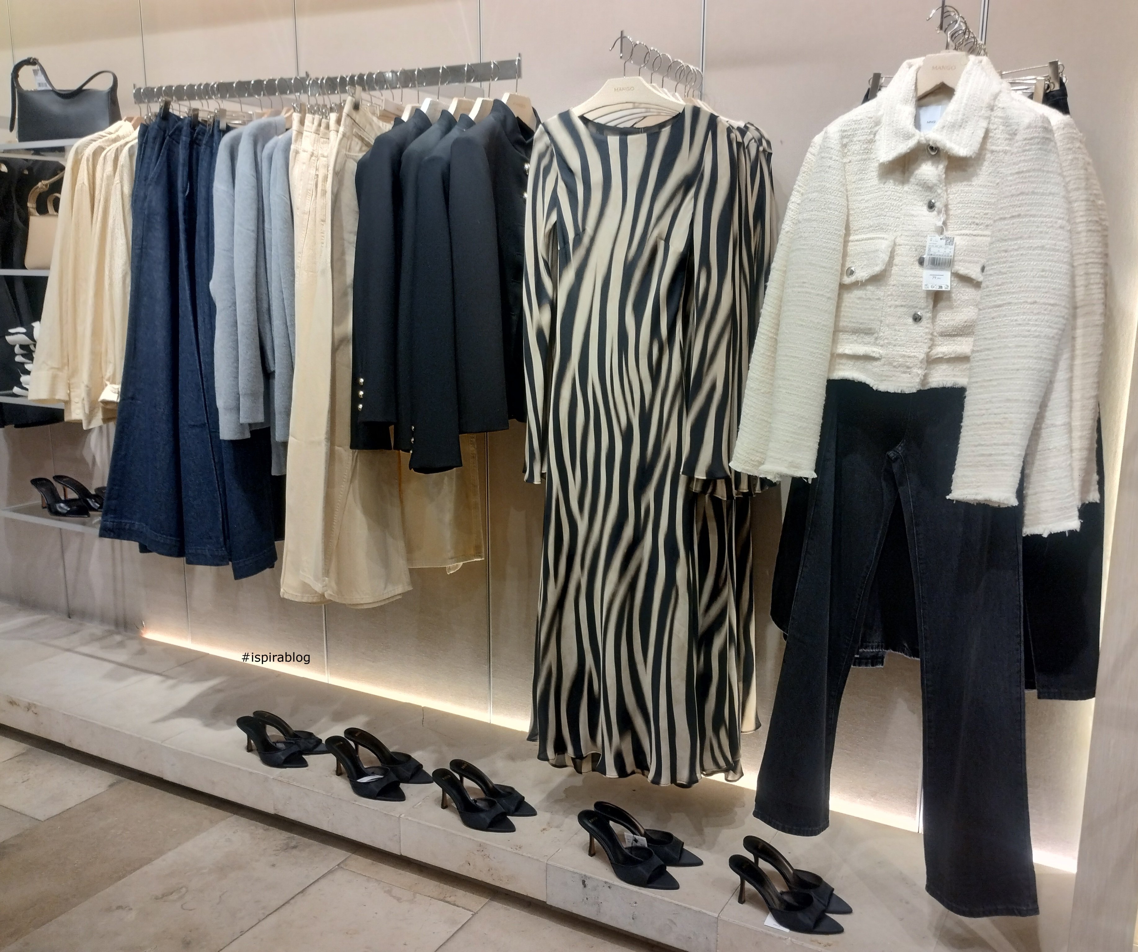 Mango Turin - Fall 2023 - Womenswear Collection - black and white garments, with patterned blouses and dresses, trousers of various colours, grey coats, handbags and black boots 2023-10-13
