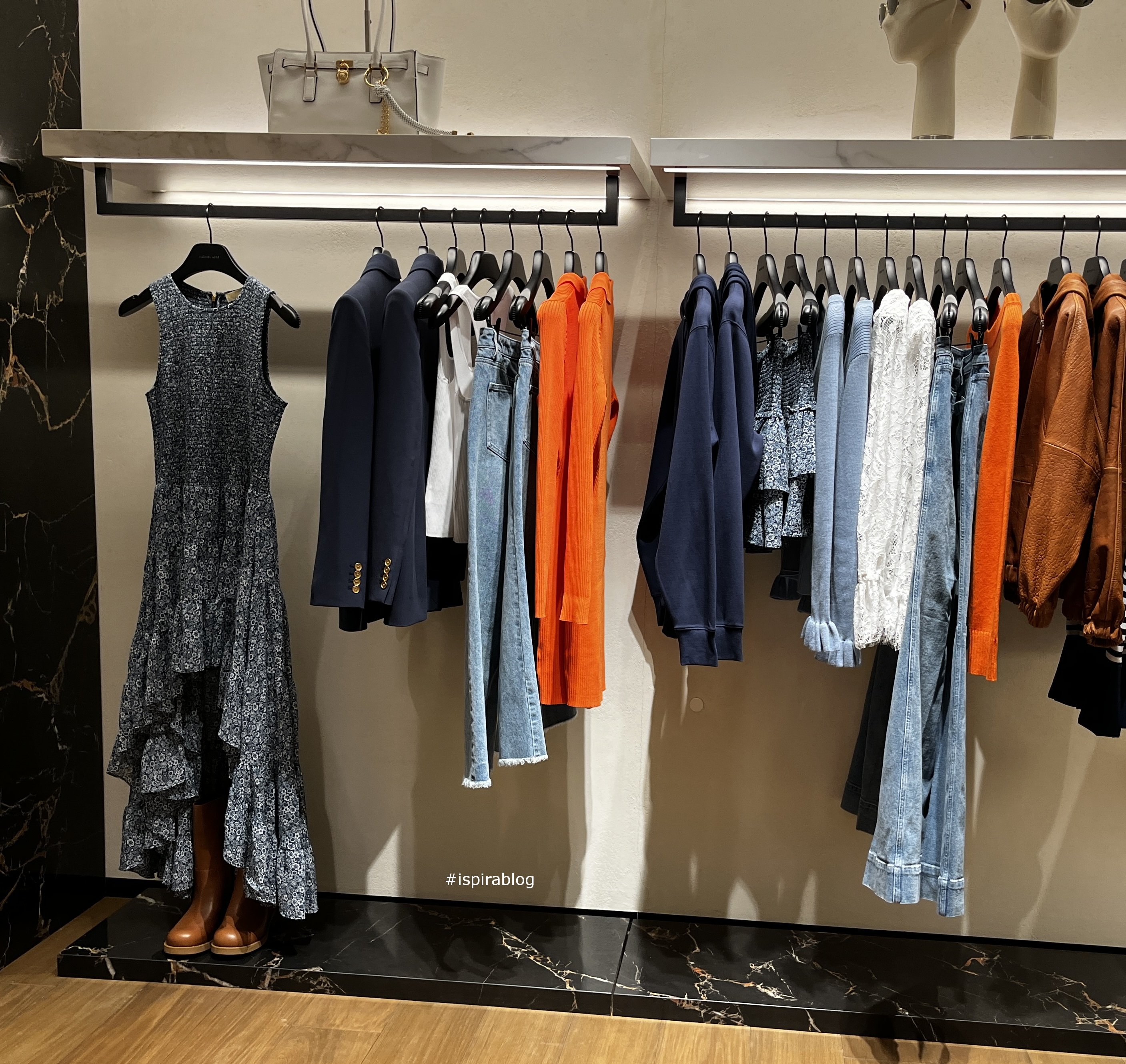 Michael Kors London - Spring 2026 Collection - orange and blue womensweaar, with jeans, white top tanks and jerseys, and grey skirts and dress 2026-02-04