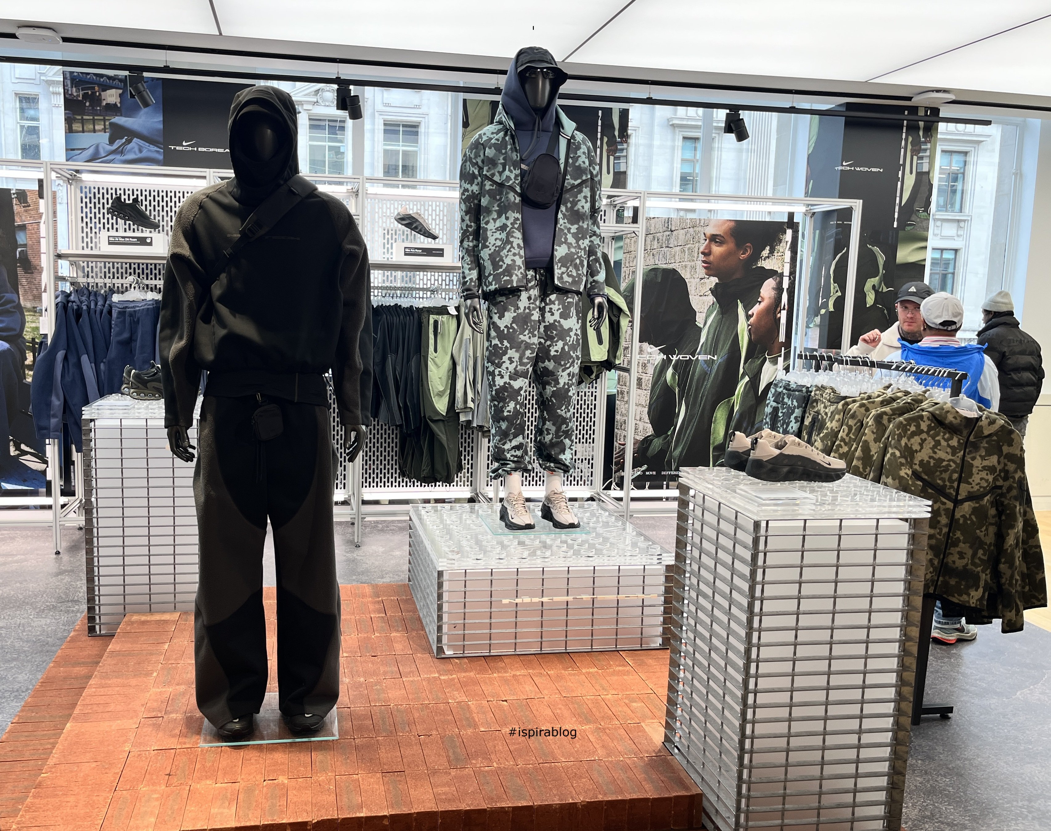 Nike London - Fall 2025 Collection - entrance of the store, black running sportswear with lilac shorts, running sneakers and hats with visor 2025-11-21