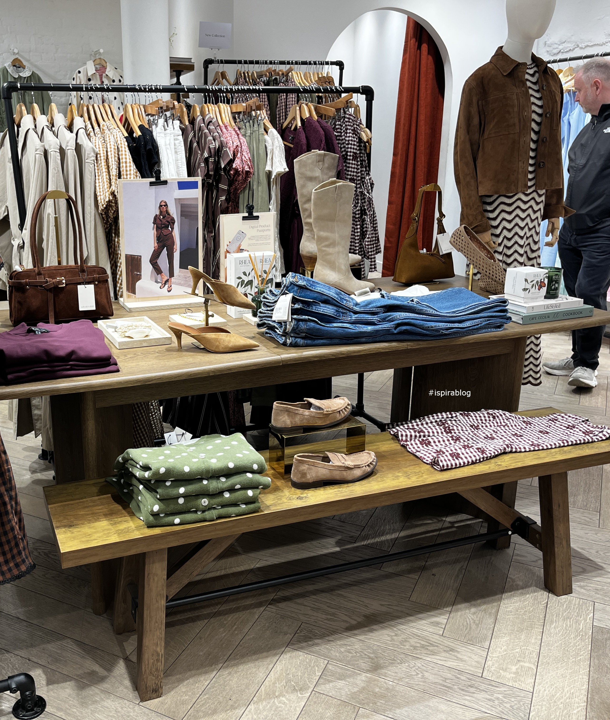 Nobody's Child London - Spring 2026 Collection - white blouses and T-shirts with jeans, brown boots and handbag, and womenswear of various colours and patterns 2026-03-10