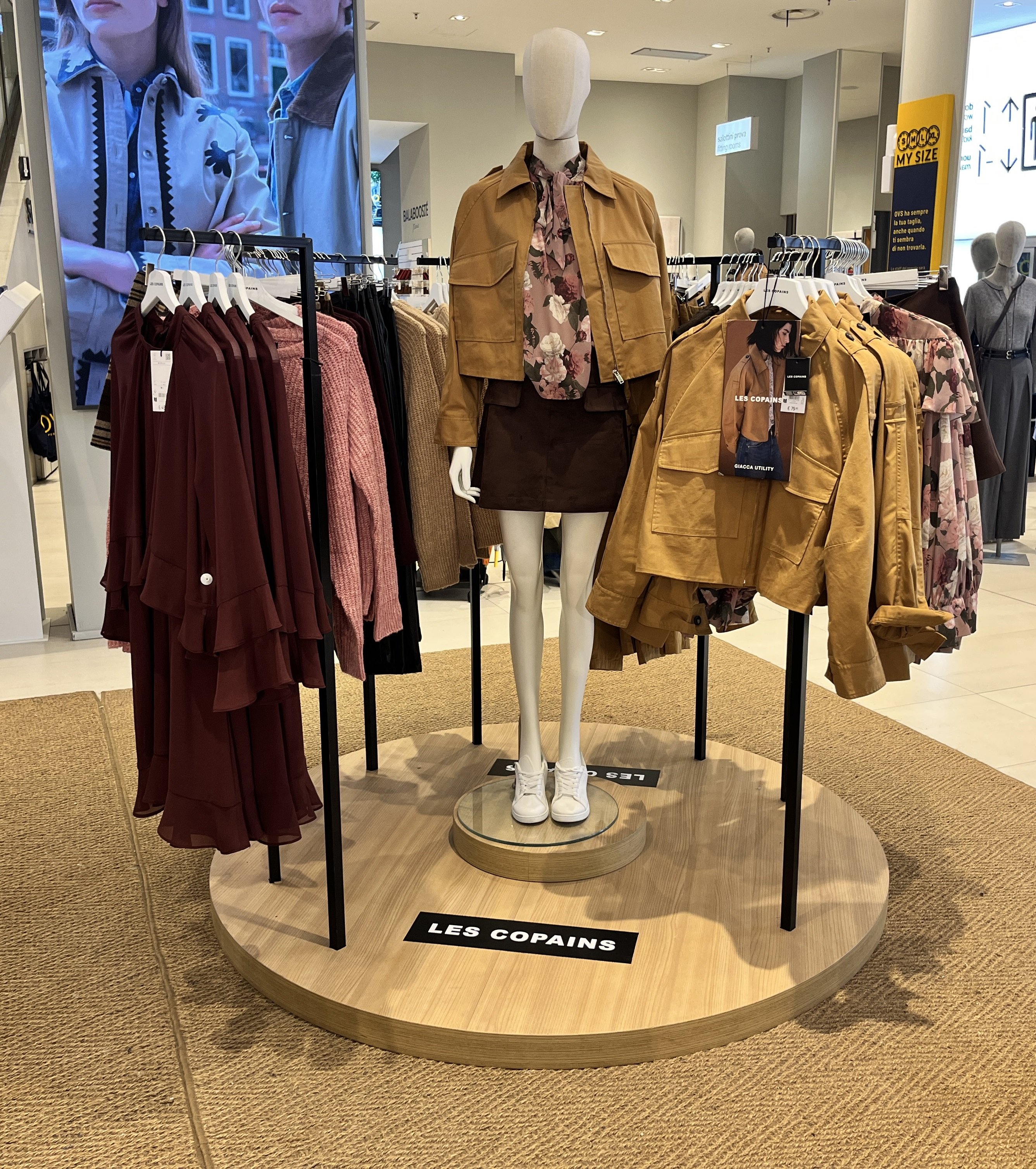 OVS Milan - Fall 2025 Womenswear Collection - Les Copains: beige jackets with patterned blouses, brown skirt, sweaters of various colours and black trousers 2025-10-07