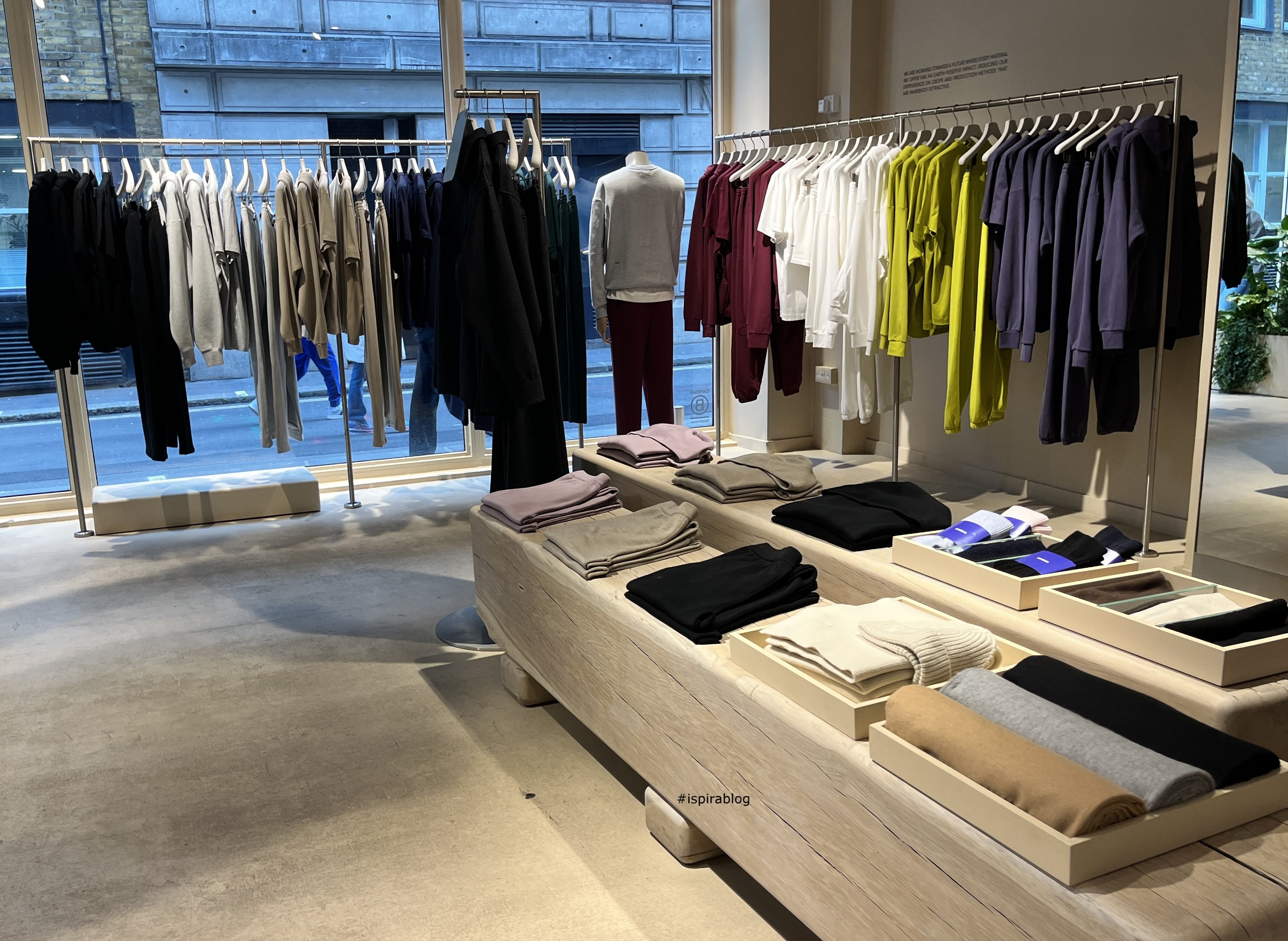 Pangaia London - Fall 2025 Collection - facade of the store, in a window blue T-shirt and shorts, with black bag 2025-11-25