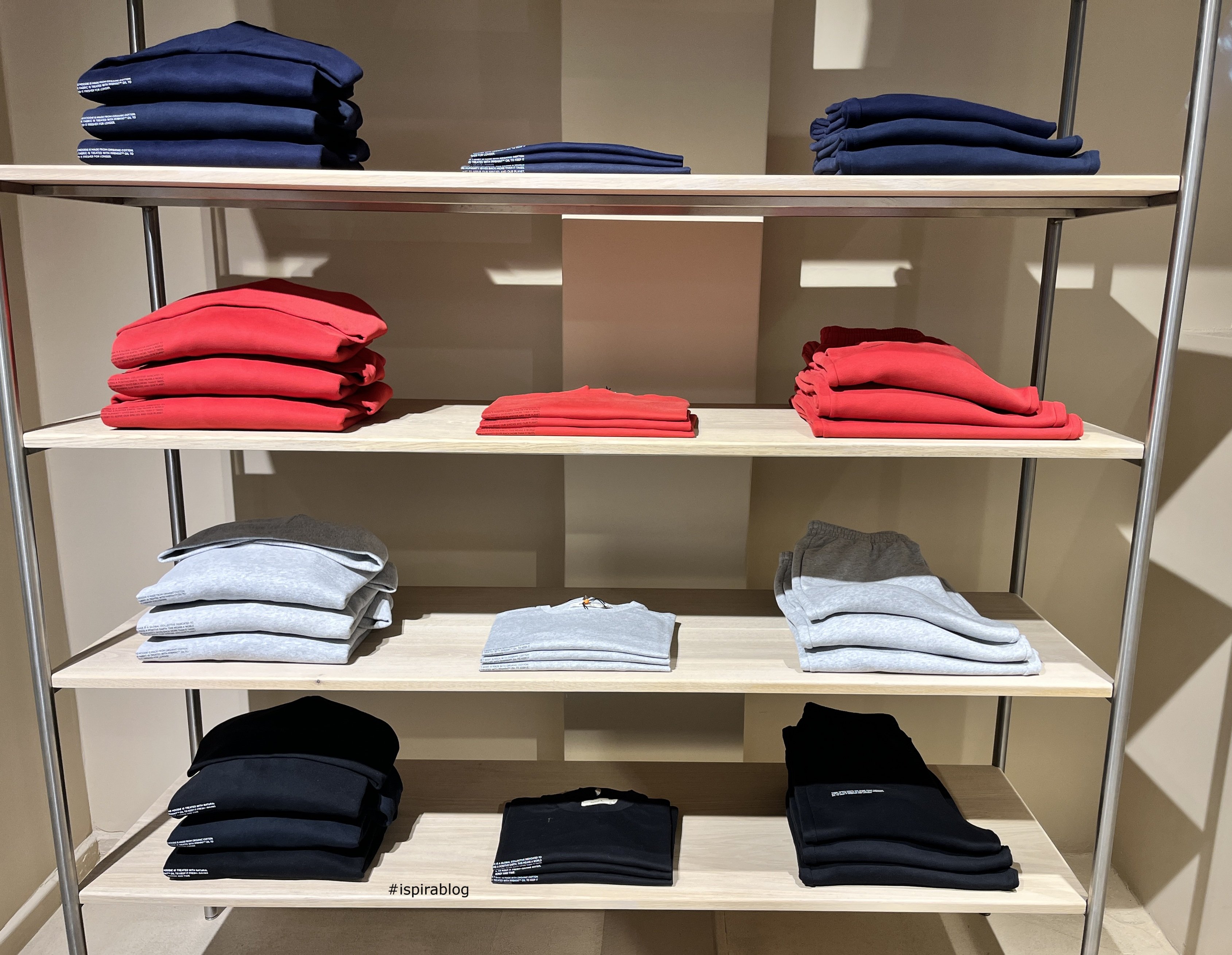 Pangaia London - Fall 2025 Collection - facade of the store, in a window blue T-shirt and shorts, with black bag 2025-11-25