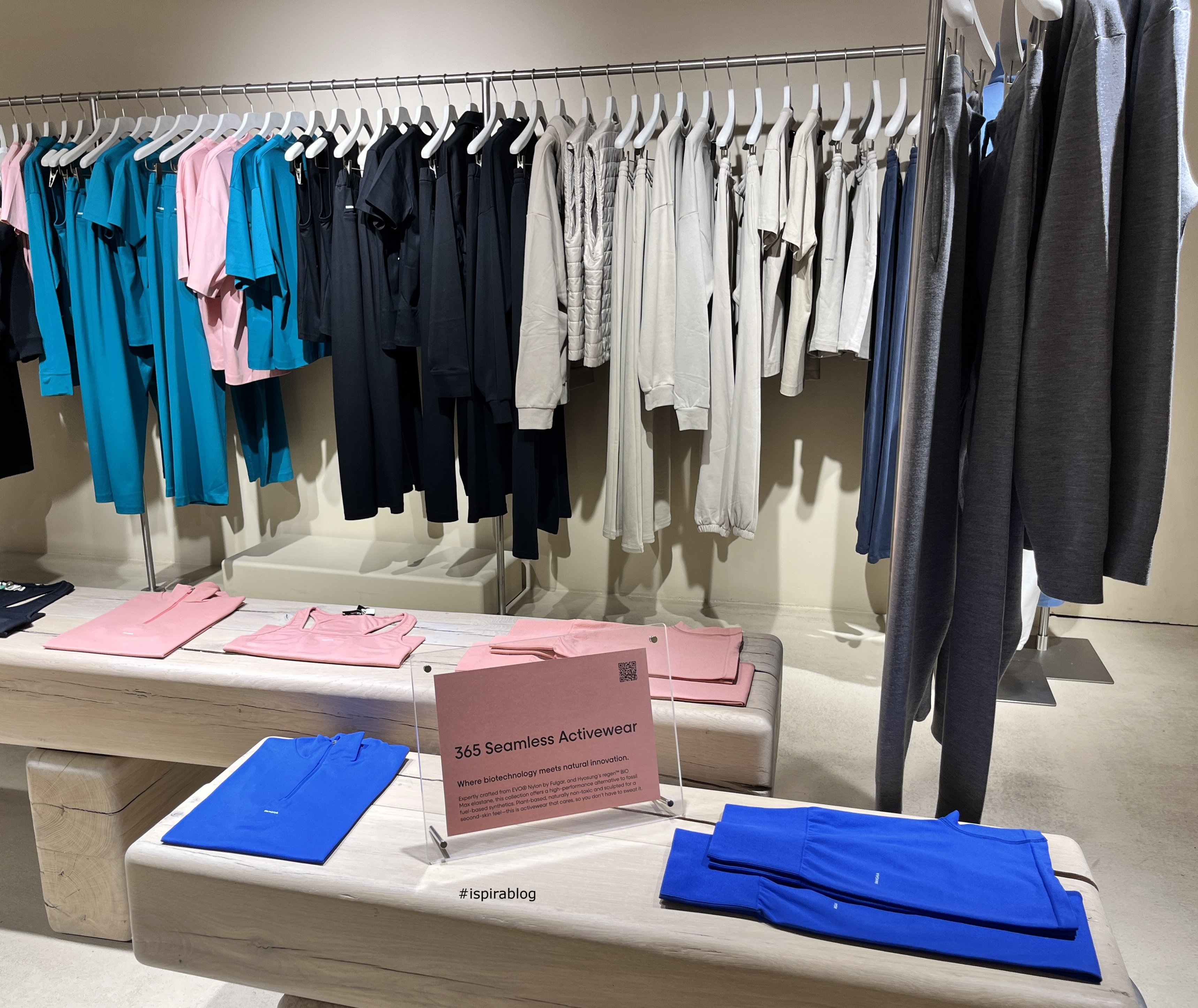 Pangaia London - Fall 2025 Collection - facade of the store, in a window blue T-shirt and shorts, with black bag 2025-11-25
