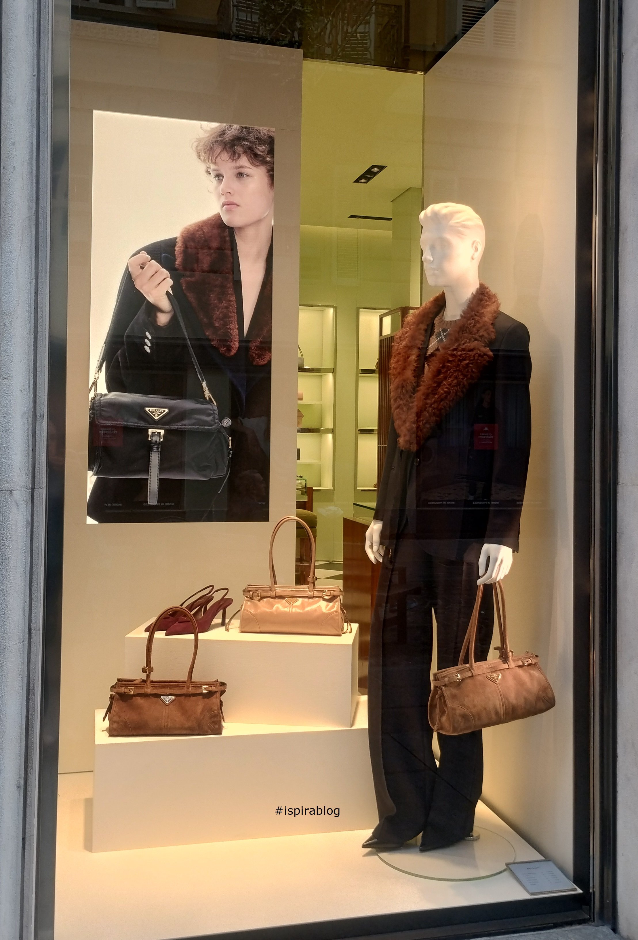 Prada - Milan - Autumn 2018 - Womenswear Collection - brown coat and black clothes with black and white handbags and heeled black shoes 2018-11-28