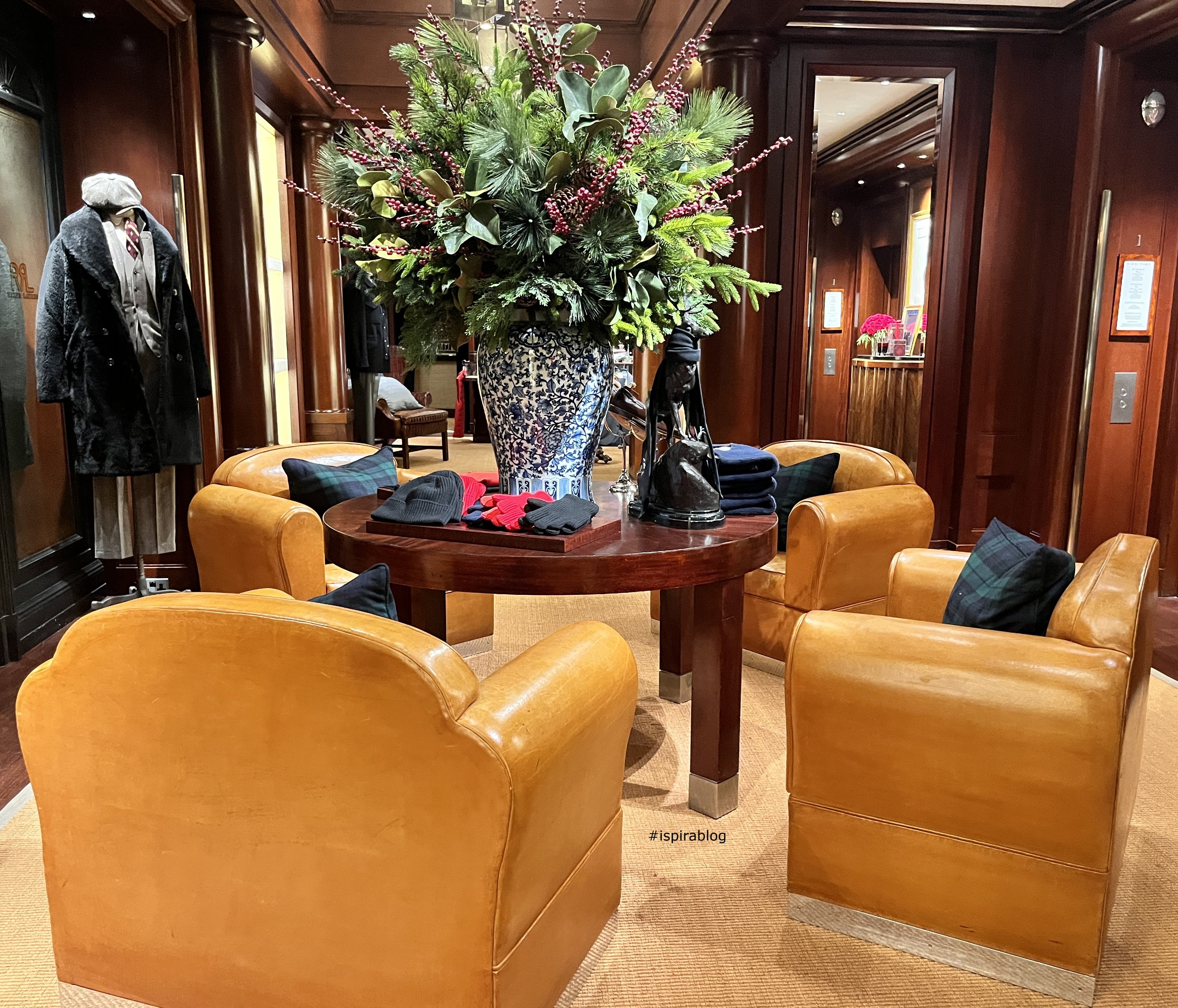Ralph Lauren London - Winter 2025/26 Collection - lounge inside the shop with caps and gloves, black fur coat and beige suit 2026-01-15