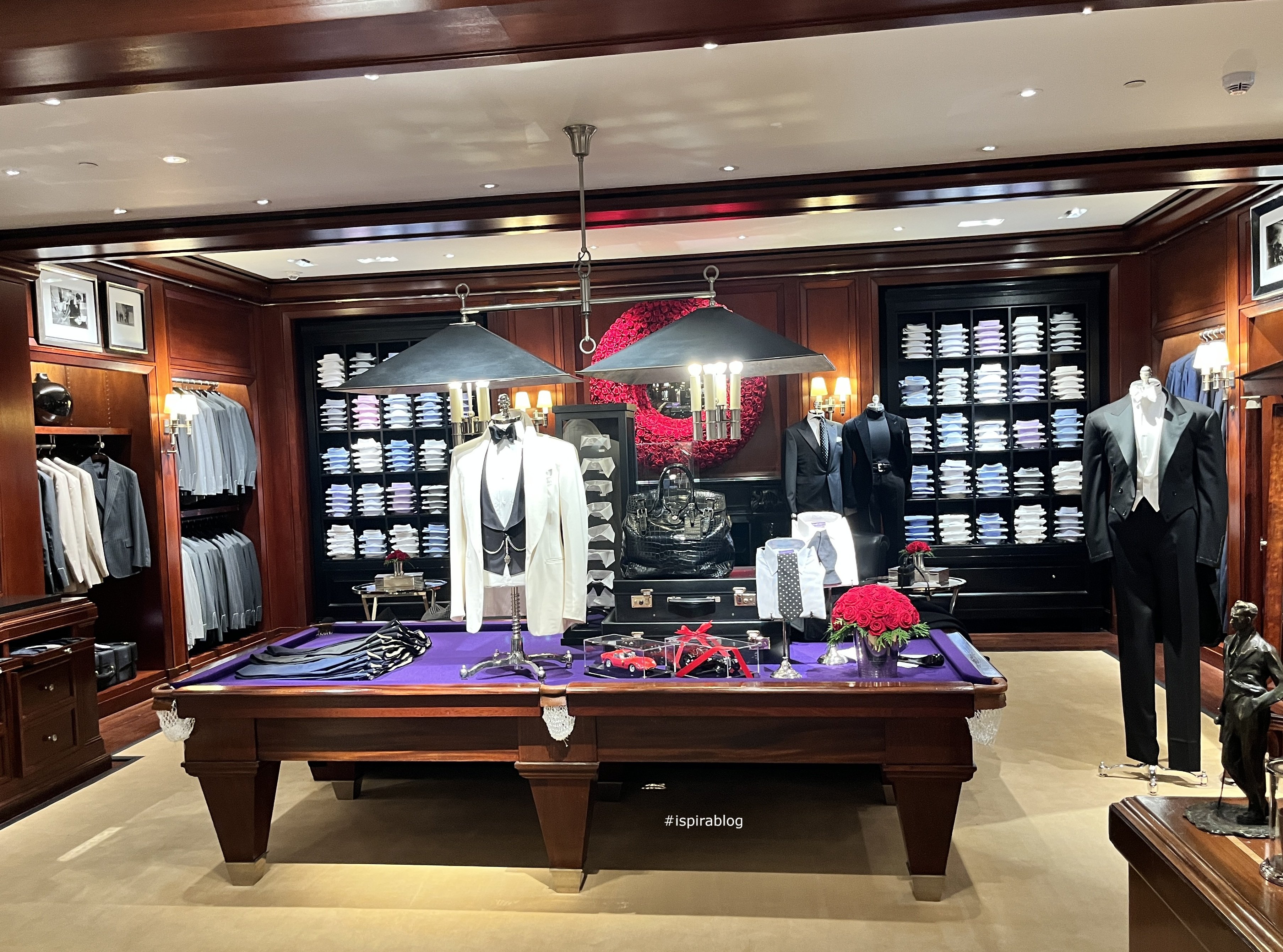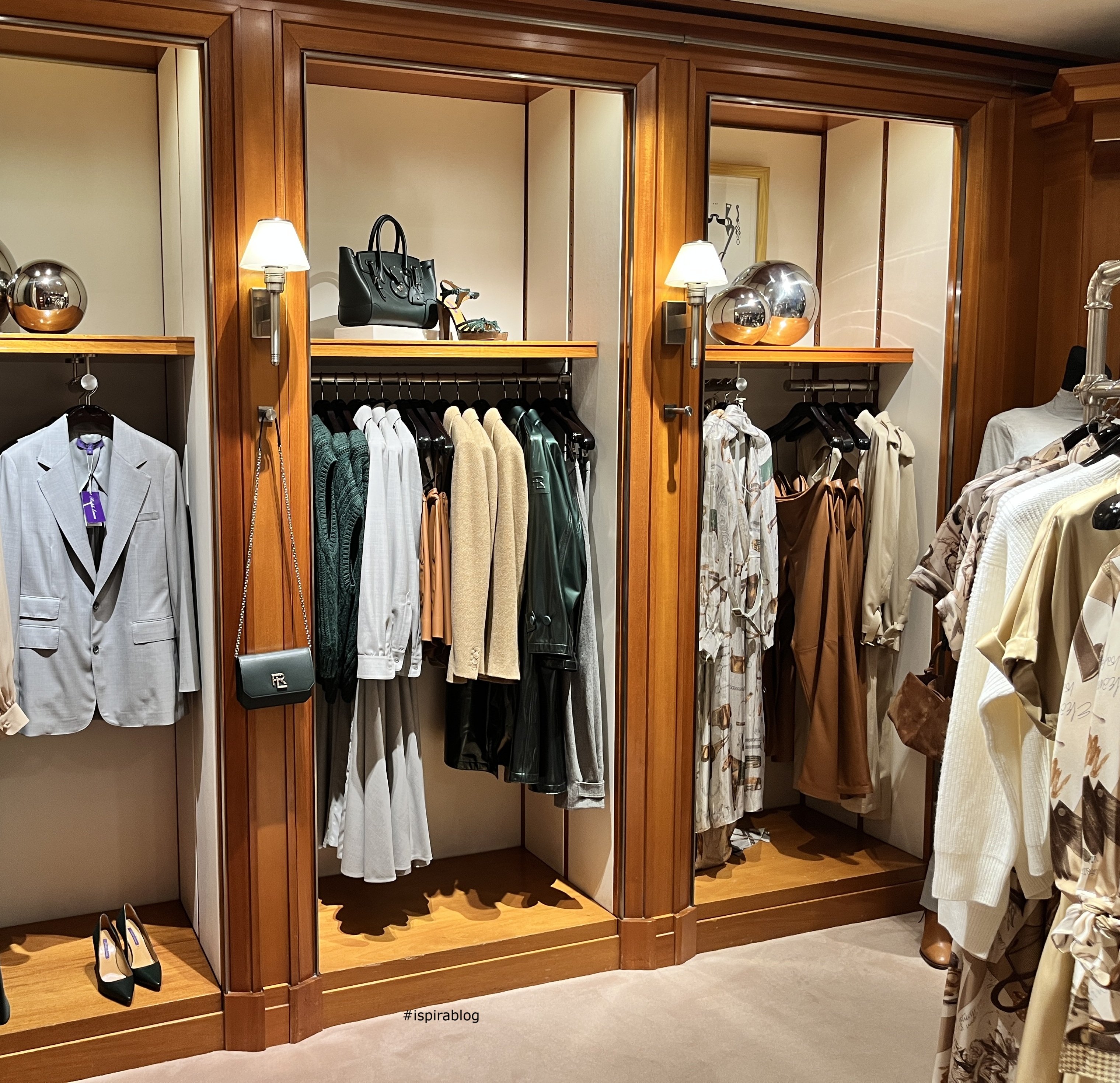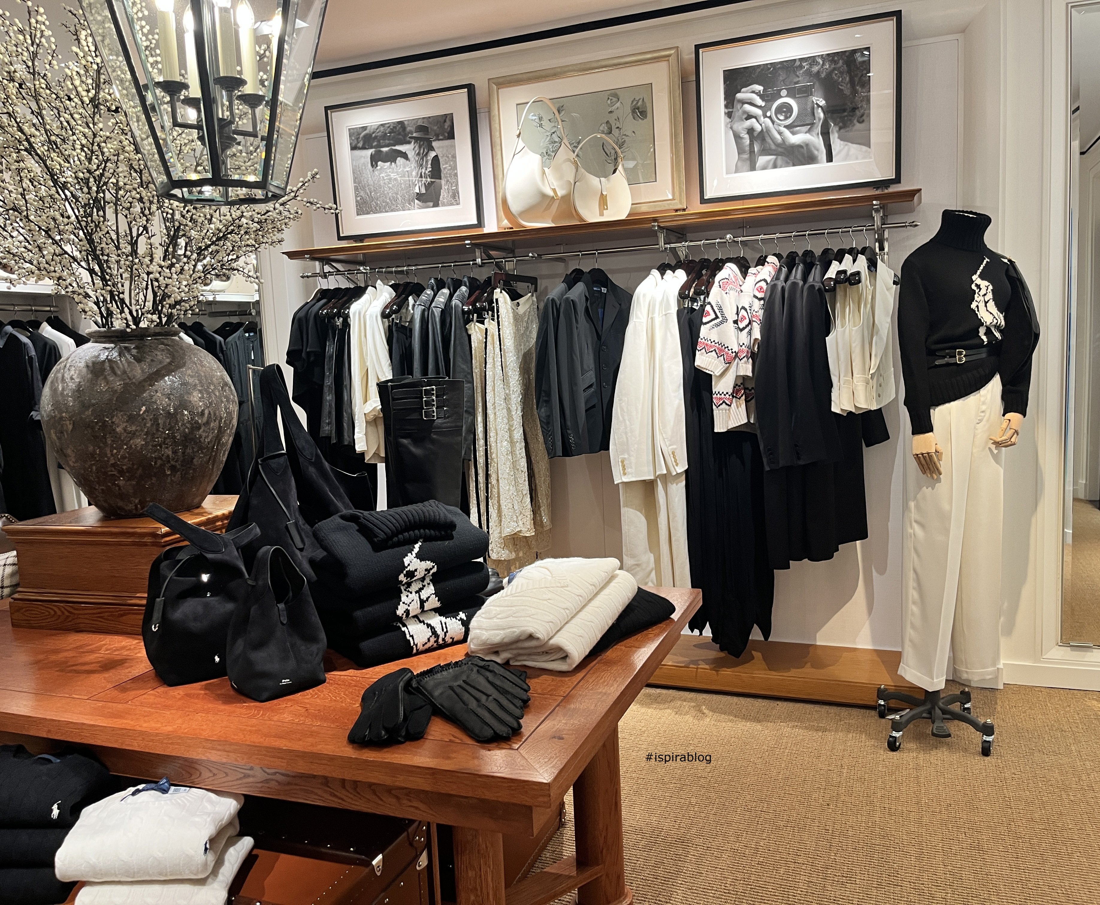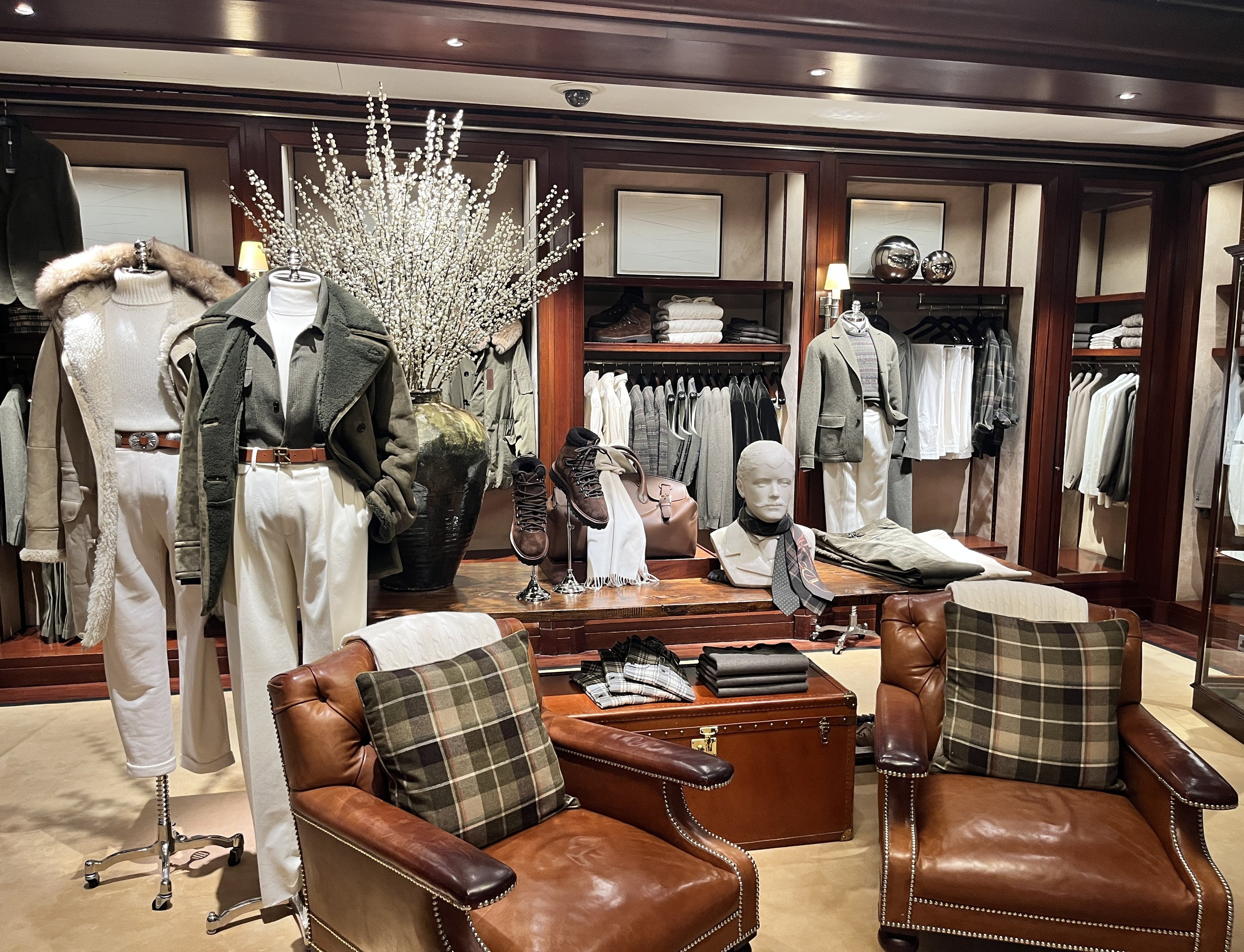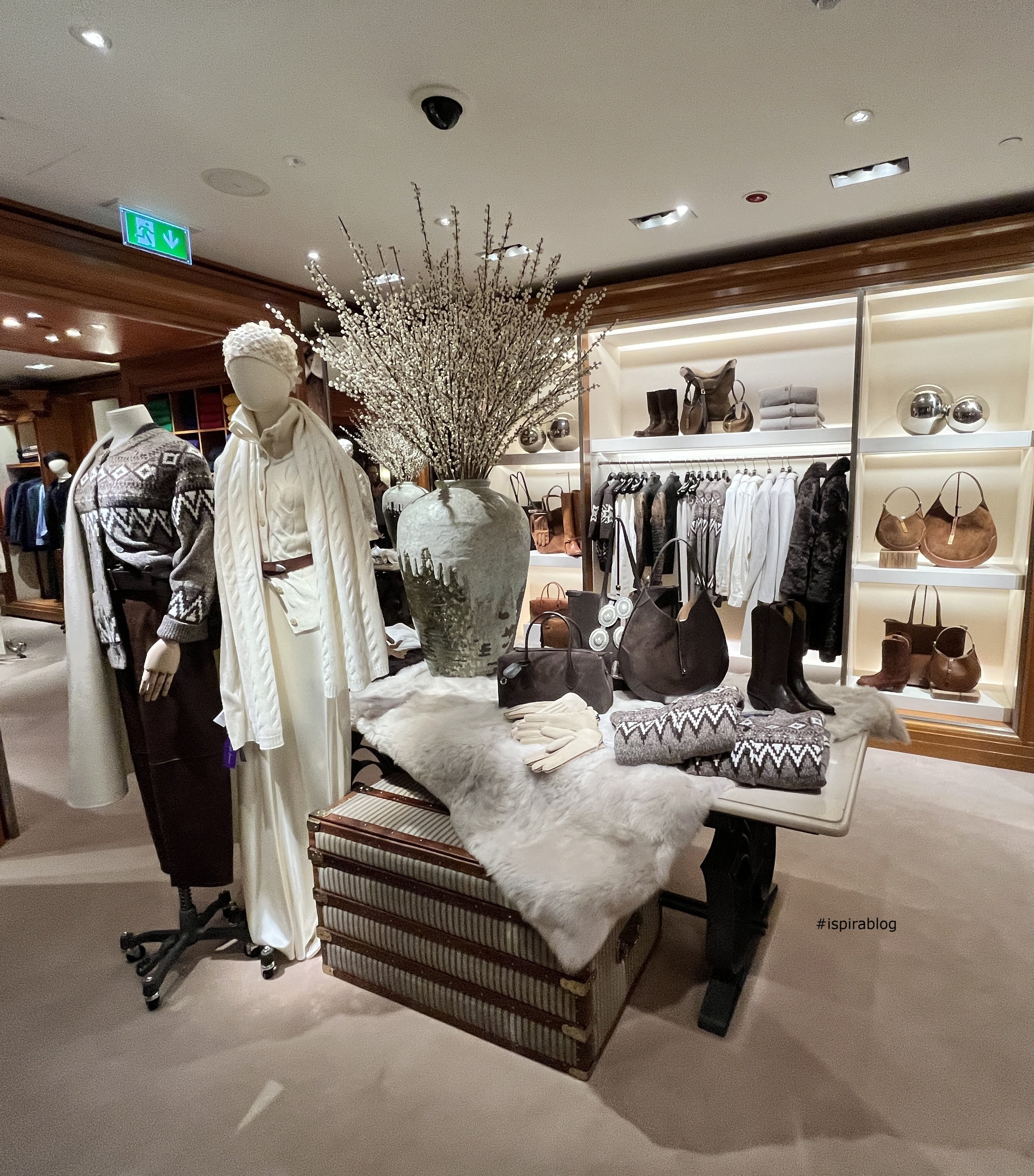 Ralph Lauren London - Winter 2025/26 Collection - lounge inside the shop with caps and gloves, black fur coat and beige suit 2026-01-15