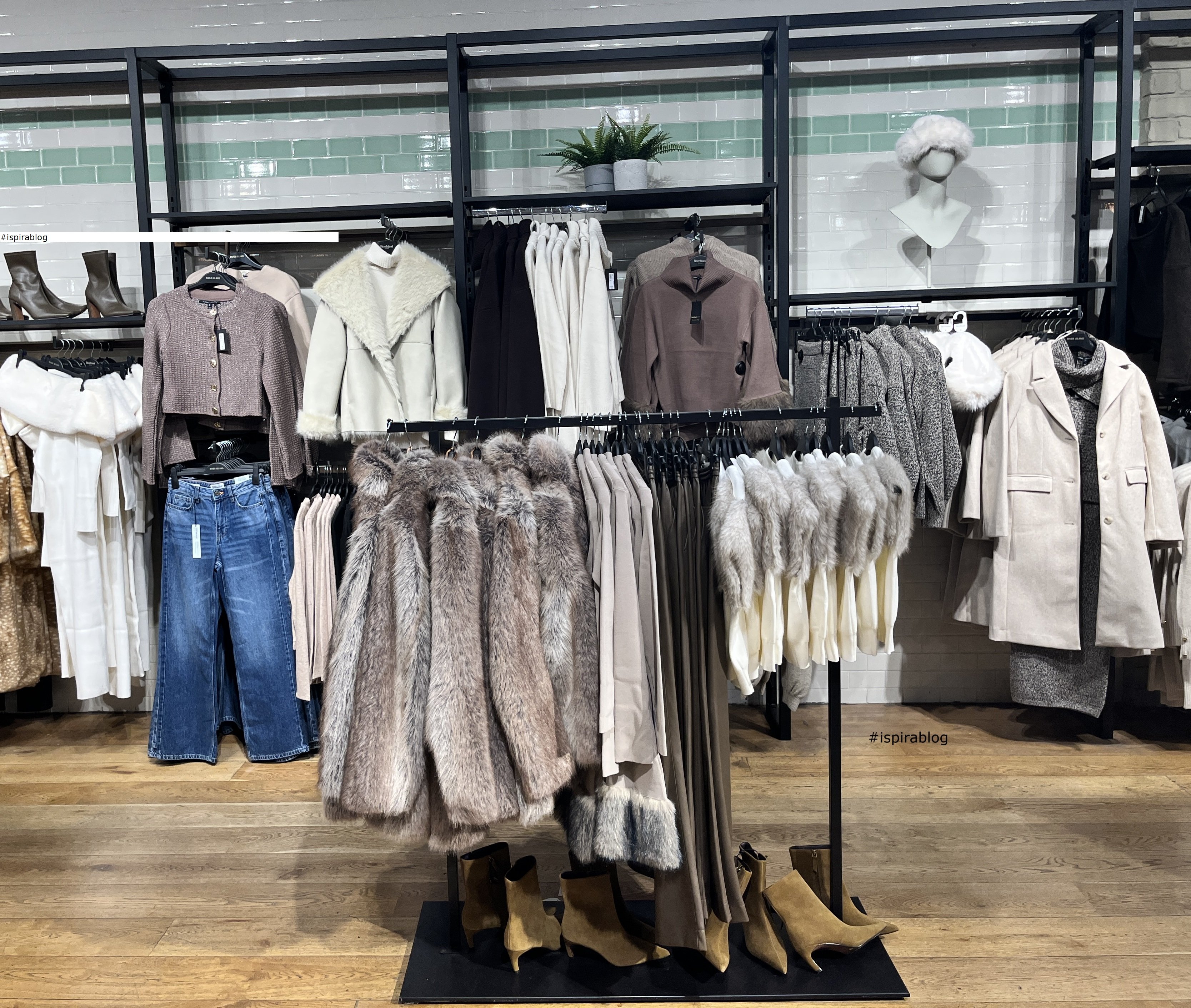 River Island London - Winter 2025 Collection - jeans of various colours, with black and grey shirts, and grey fur jacket 2025-12-10