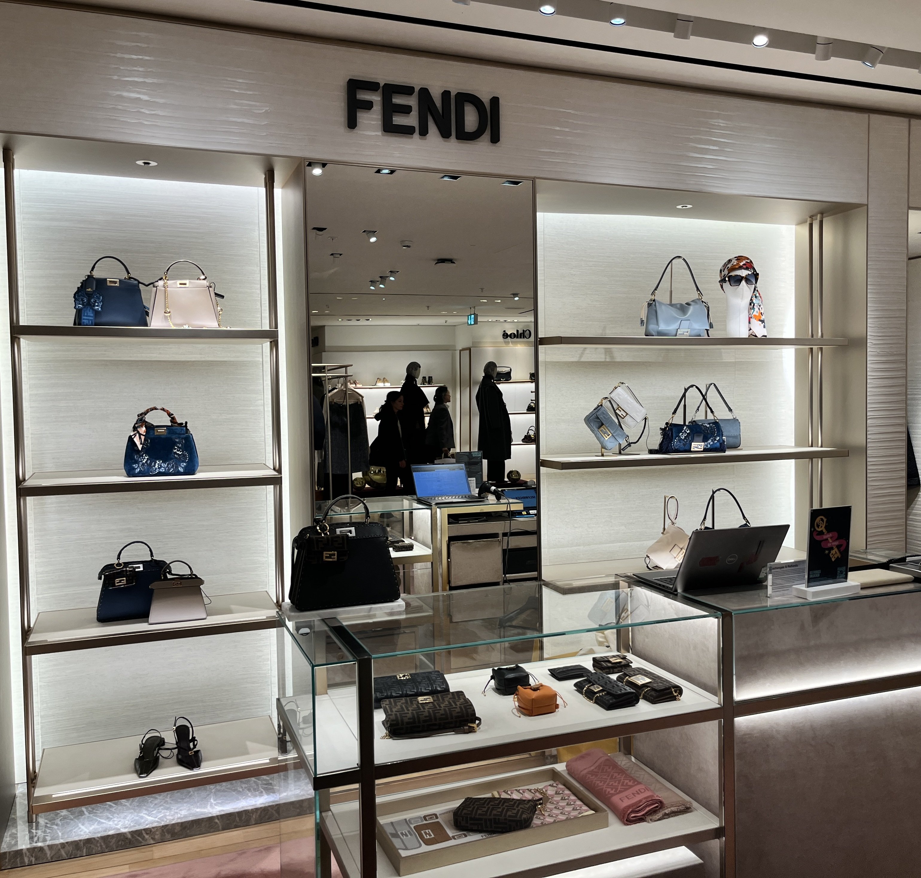 Selfridges - London - Spring 2020 Preview - Womenswear Collection - FENDI pink long dress with pink handbag and heels black shoes, on the back leather handbags and accessories 2020-02-05