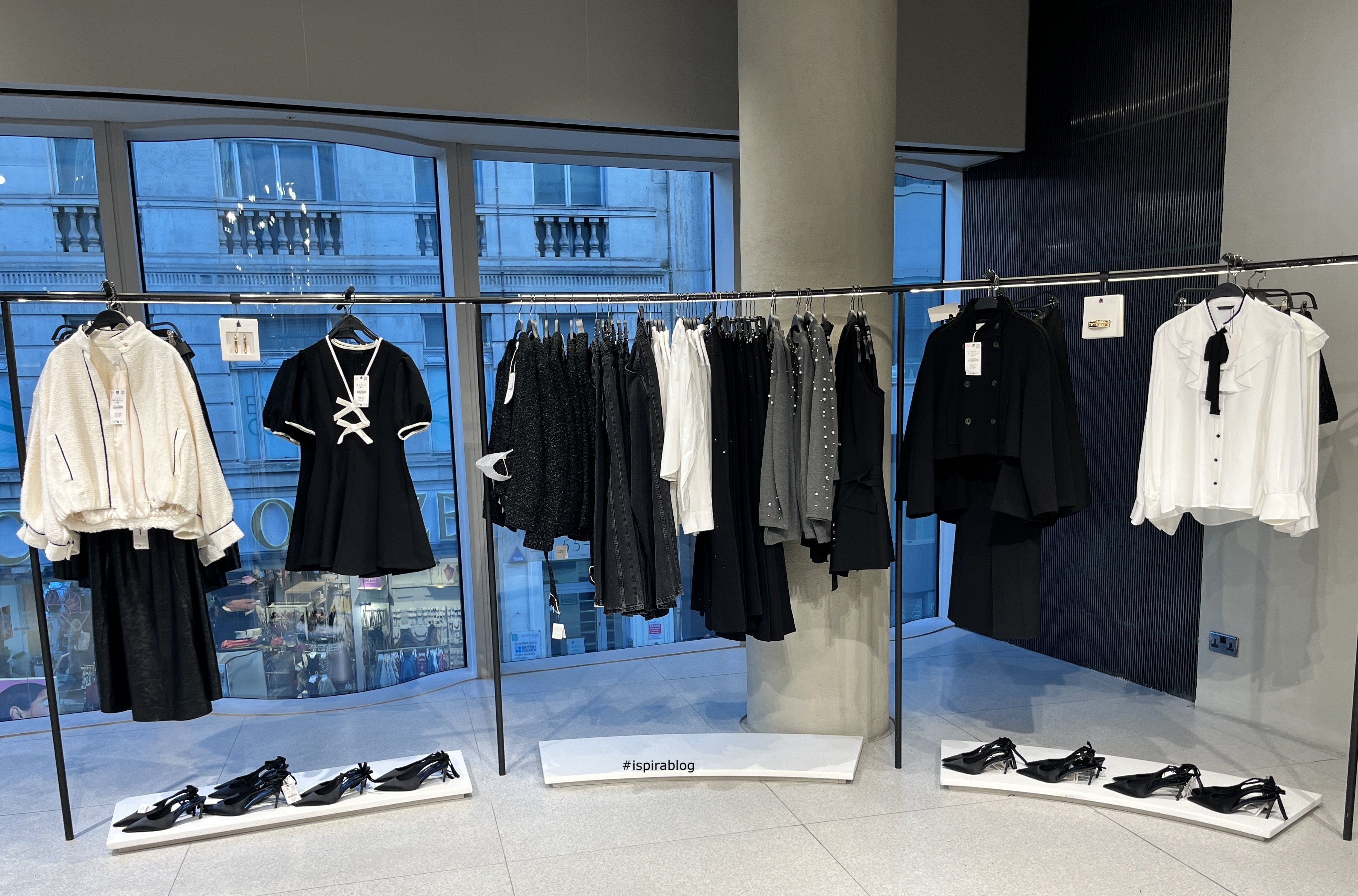 Zara London - Fall 2025 Collection - white jackets and shirts, with black dresses, jackets and trousers, grey sweatshirts, and black shoes 2025-11-17