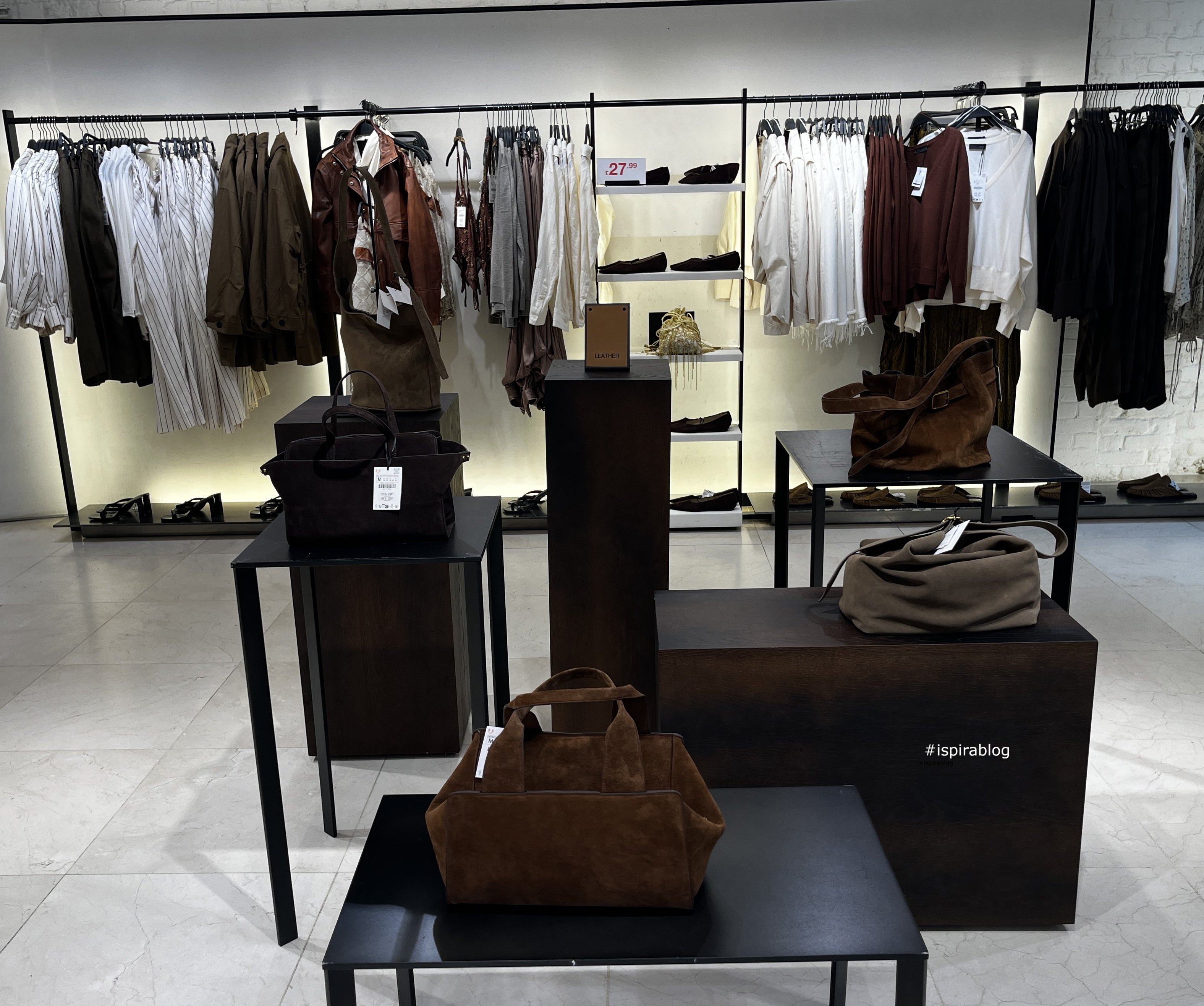 Zara London - Spring 2026 Collection - handbags of various colours with white, brown and black womenswear and black shoes 2026-03-03