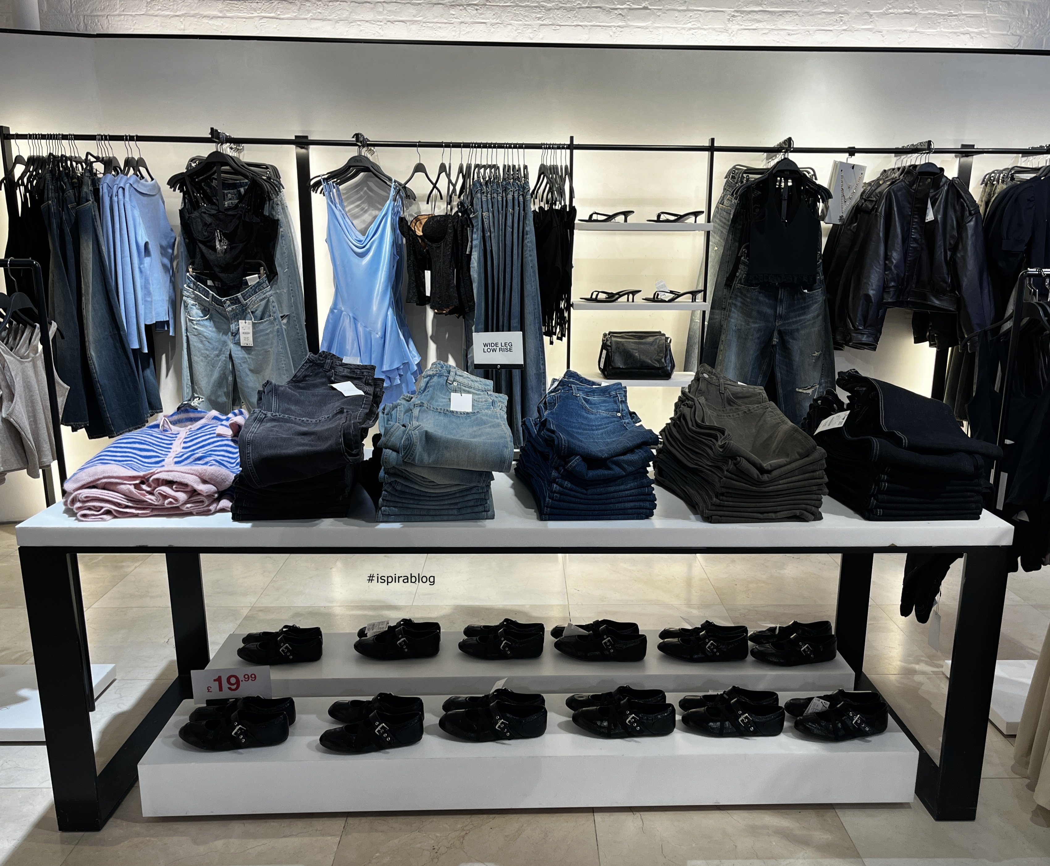 Zara London - Spring 2026 Collection - jeans of various colours with striped jumpers, black shoes, black womenswear, light blue dresses and shirts, and jeans 2026-03-03